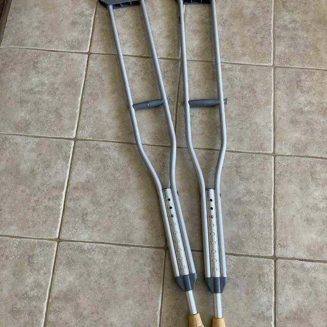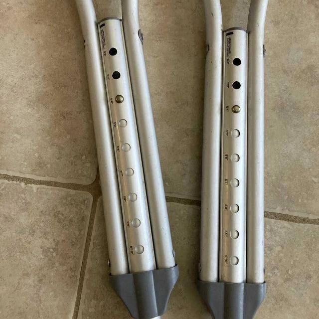 Pair of lightweight aluminum medical crutches in good condition, perfect for injury recovery, post-surgery support, or mobility assistance. These adult-size crutches adjust easily to fit different heights and are durable yet lightweight for everyday use. Features: • Adjustable height: fits approx. 5’2” to 5’10” (157–178 cm) • Lightweight yet sturdy aluminum frame • Note: Underarm pads are missing — you can wrap the tops in a small towel for comfort • Non-slip rubber tips for safe walking • Easy push-button height adjustment