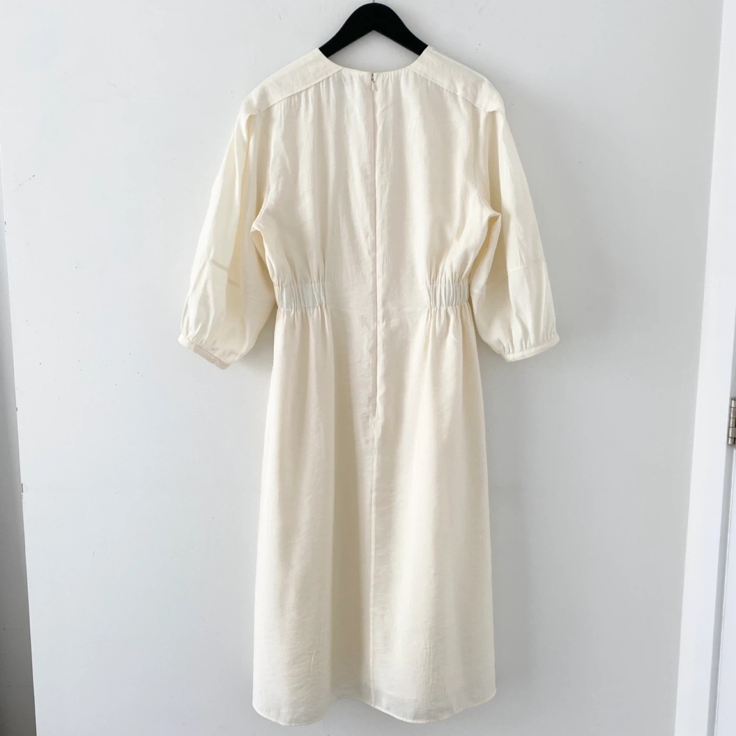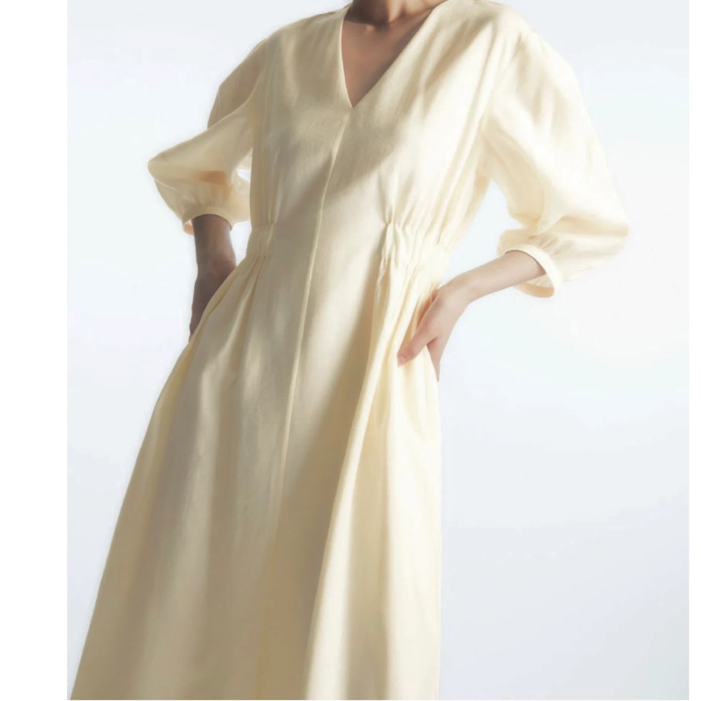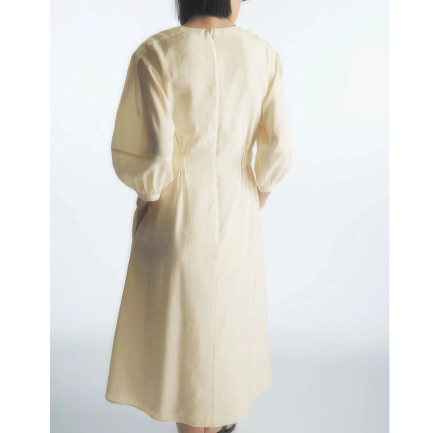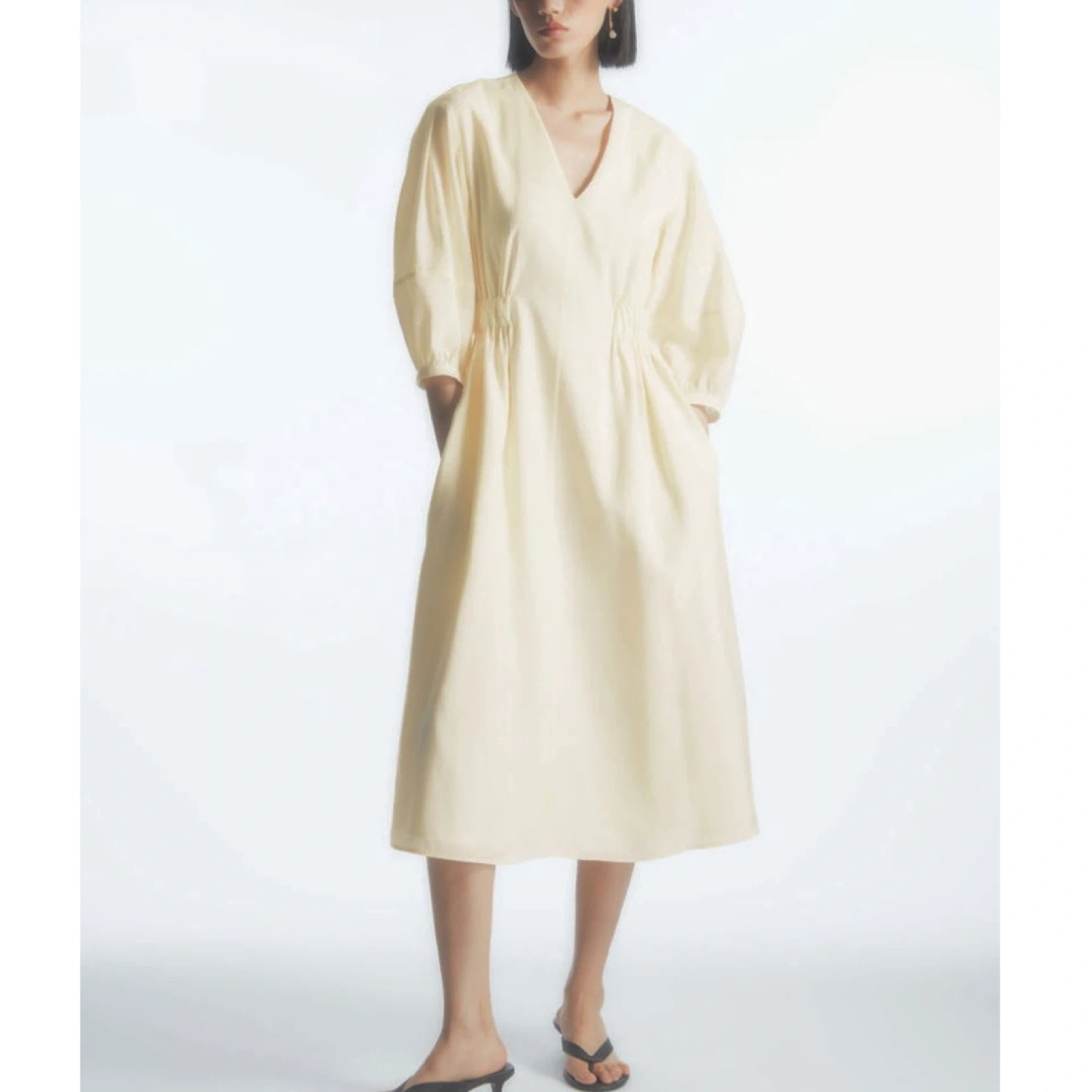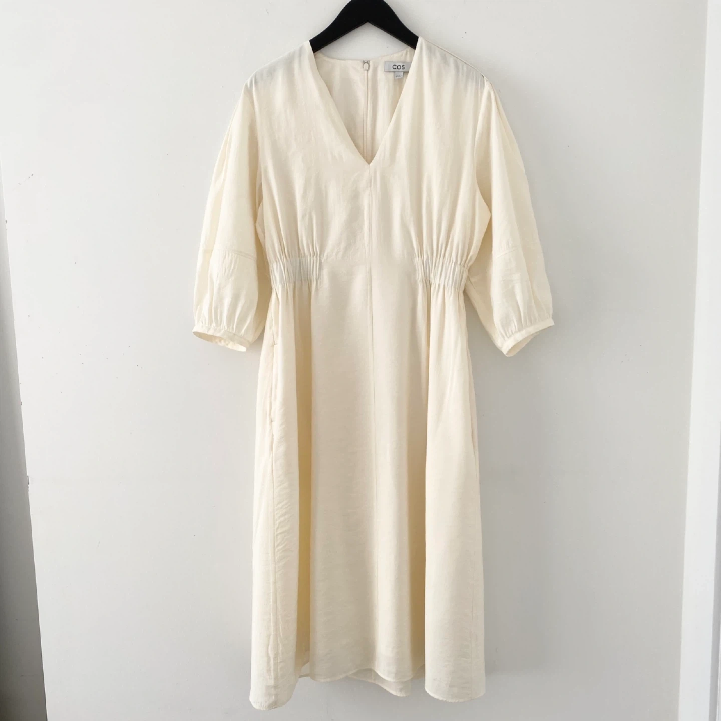 Pick up only in Leslieville (Queen and Pape) Check out other listings! COS Voluminous v-neck dress. Features elasticated ruching at waist and elbow length lantern sleeves. Made of lightweight 79% modal and 21% polyester in a light yellow / cream colour. Fully lined with lightweigth 100% cotton. Well made - inside seams are finished with french seams for extra clean finish and quality. There’s a teeny-tiny mark as per the last pic. Otherwise it’s clean and in excellent condition. Size 40 (US M) Approximate measurements laid flat Shoulder 17” Pit to pit 19” Waist 15” Shoulder to cuff 17” Center back length 46.5”
