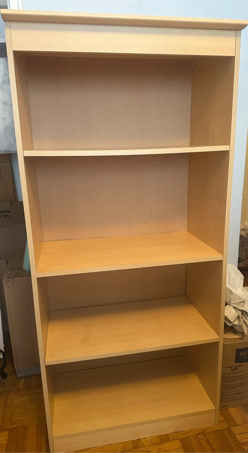 Bookshelf, used only in a bedroom, in good condition with 4 large spaces to store books, clothes or more . Great for kitchen or in garage to store tools or plastic containers, etc.