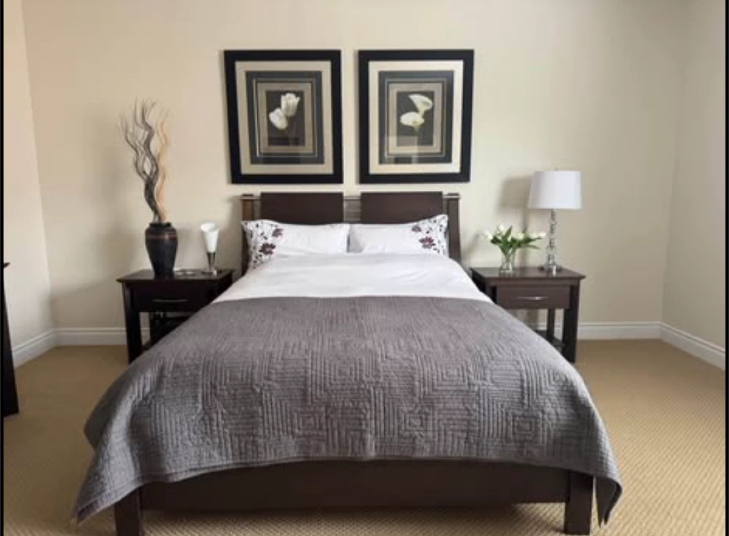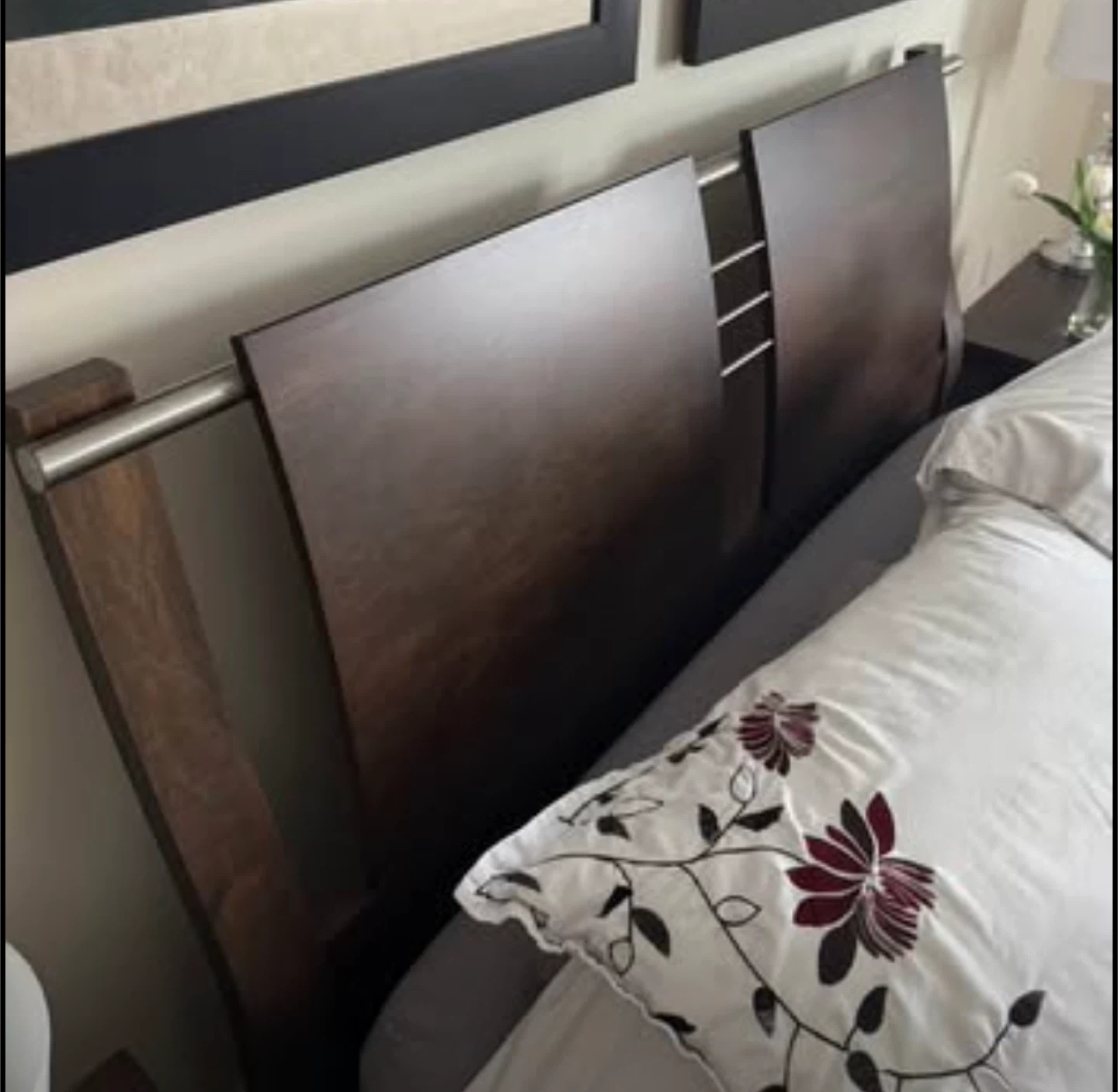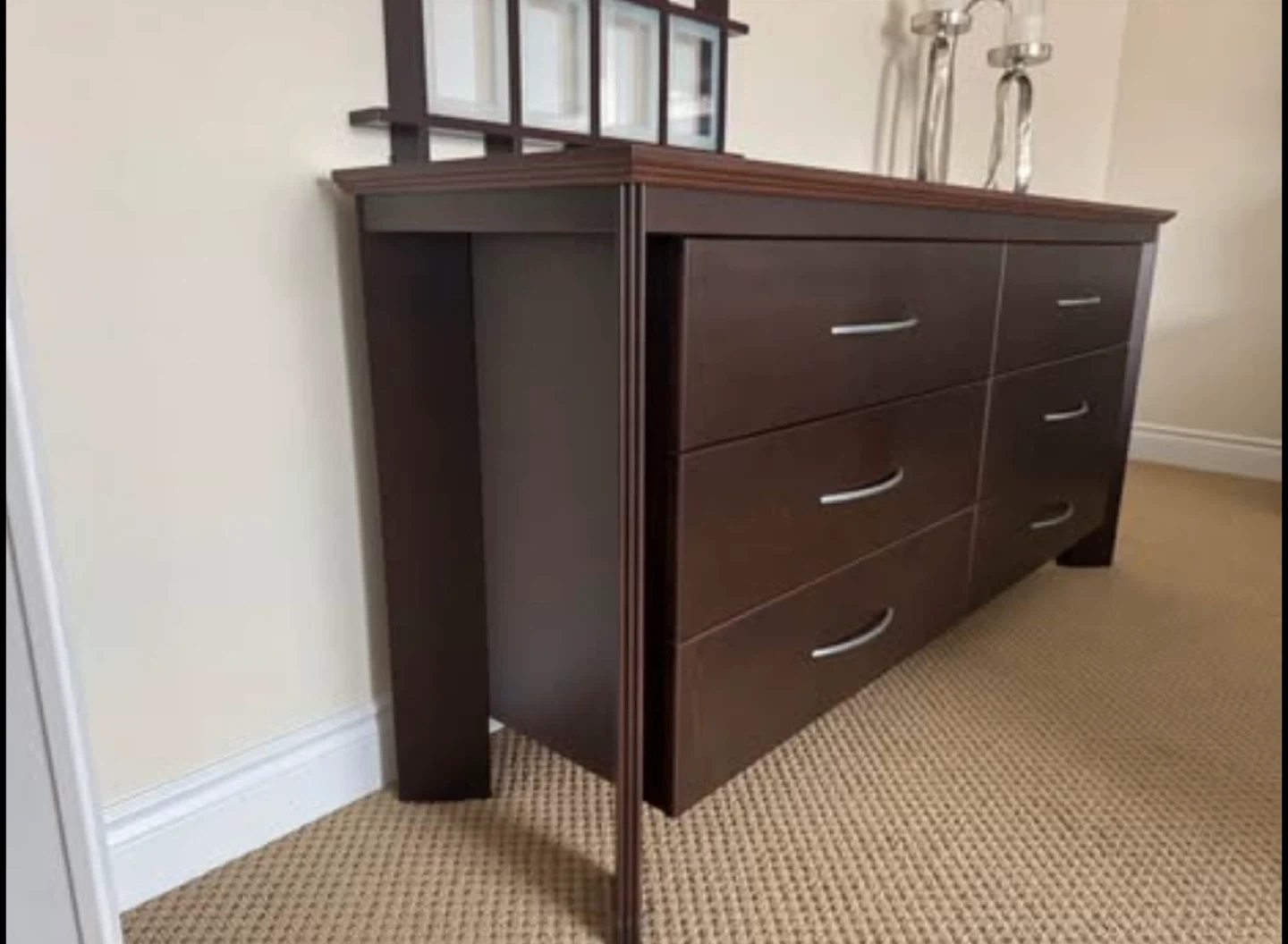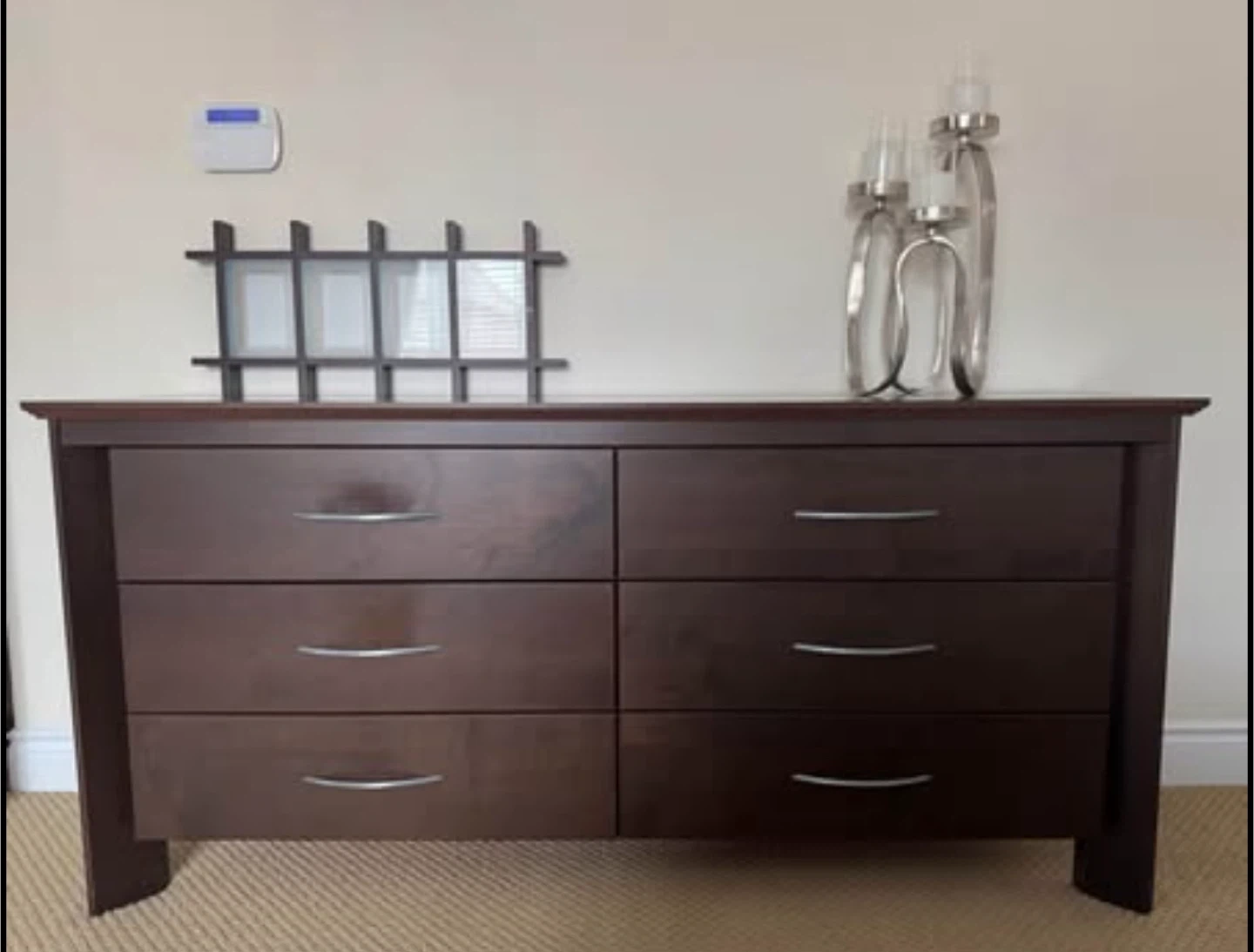 Beautiful dark wood bedroom set in excellent condition. Includes: • Queen Bed Frame with stylish headboard and low footboard (bonus: mattress base) • Armoire/Wardrobe with 2 drawers and interior shelving • 6-Drawer Dresser (wide, lots of storage) • 2 Matching Nightstands with drawers Made in Canada by Meuble Laurier (Québec) — known for quality craftsmanship, built to last. Comparable Canadian-made sets retail new for $3,000–$5,000+.” Modern, sleek design with brushed silver handles. Solid and sturdy construction. Perfect for a full bedroom upgrade. Condition: gently used, well cared for (see photos). 💰 Selling the entire set together. $ photos above bed and accessories sold separately (not included) $ mattress sold separately Measurements: Armoire: 18 1/4” D × 41 1/4” W × 66” H Dresser: 18 1/4” D × 68” W × 32” H Night stand: (x2): 17” D × 26” W × 23 3/4” H Bed Frame (Queen): 88” L × 63 1/2” W × 45 1/4” H PICKUP ONLY CASH SOLD AS A SET 1350 OBO