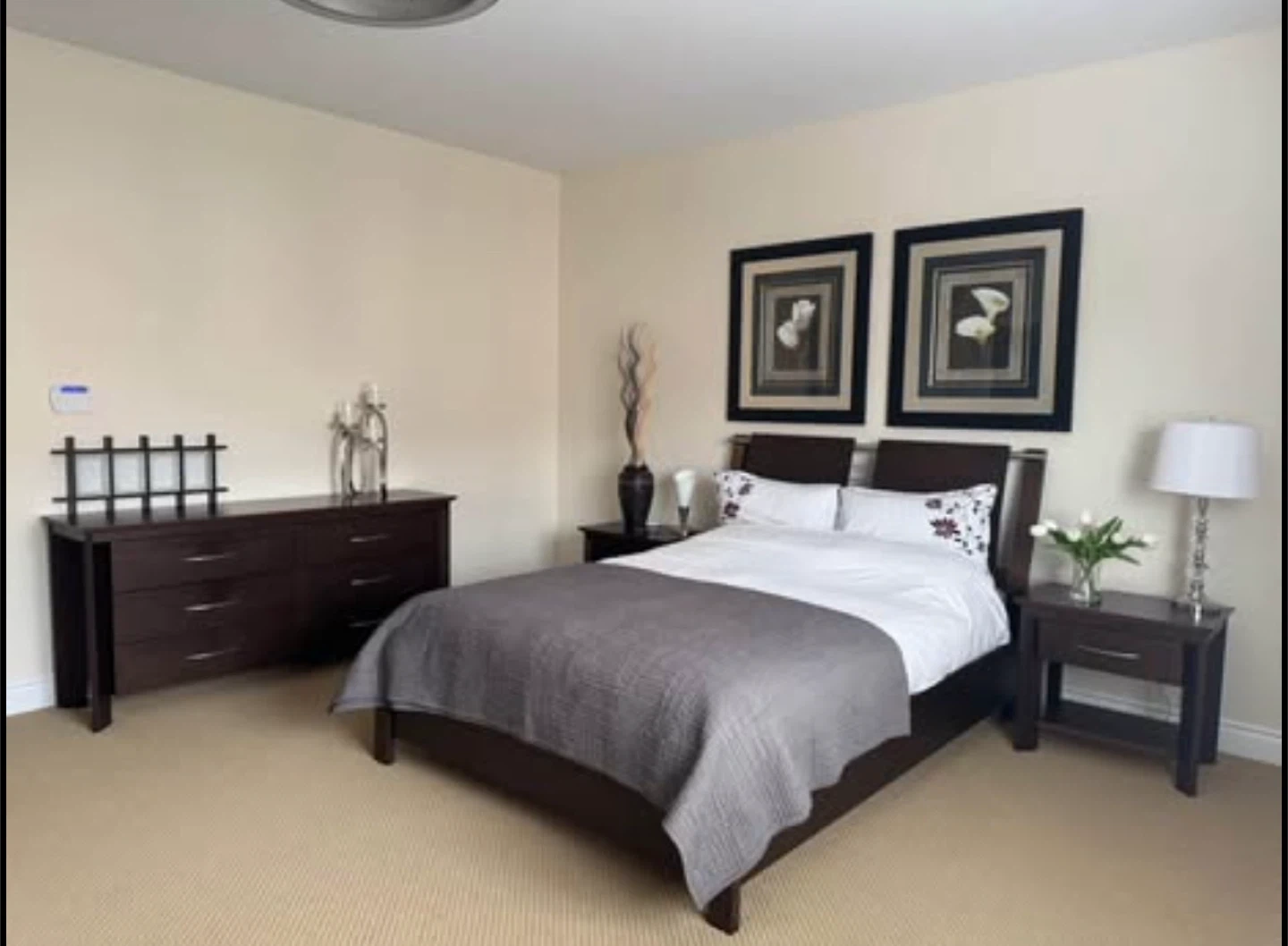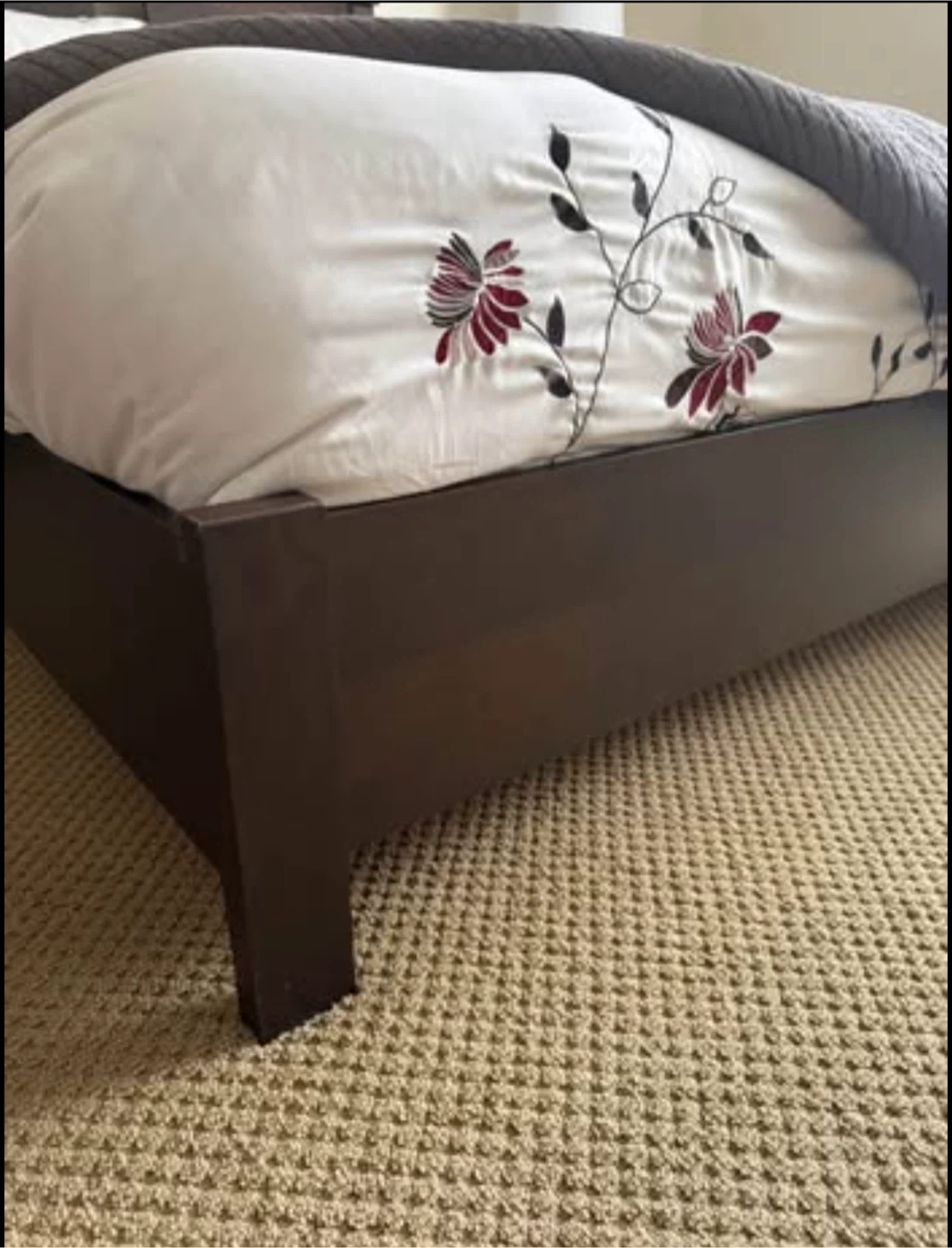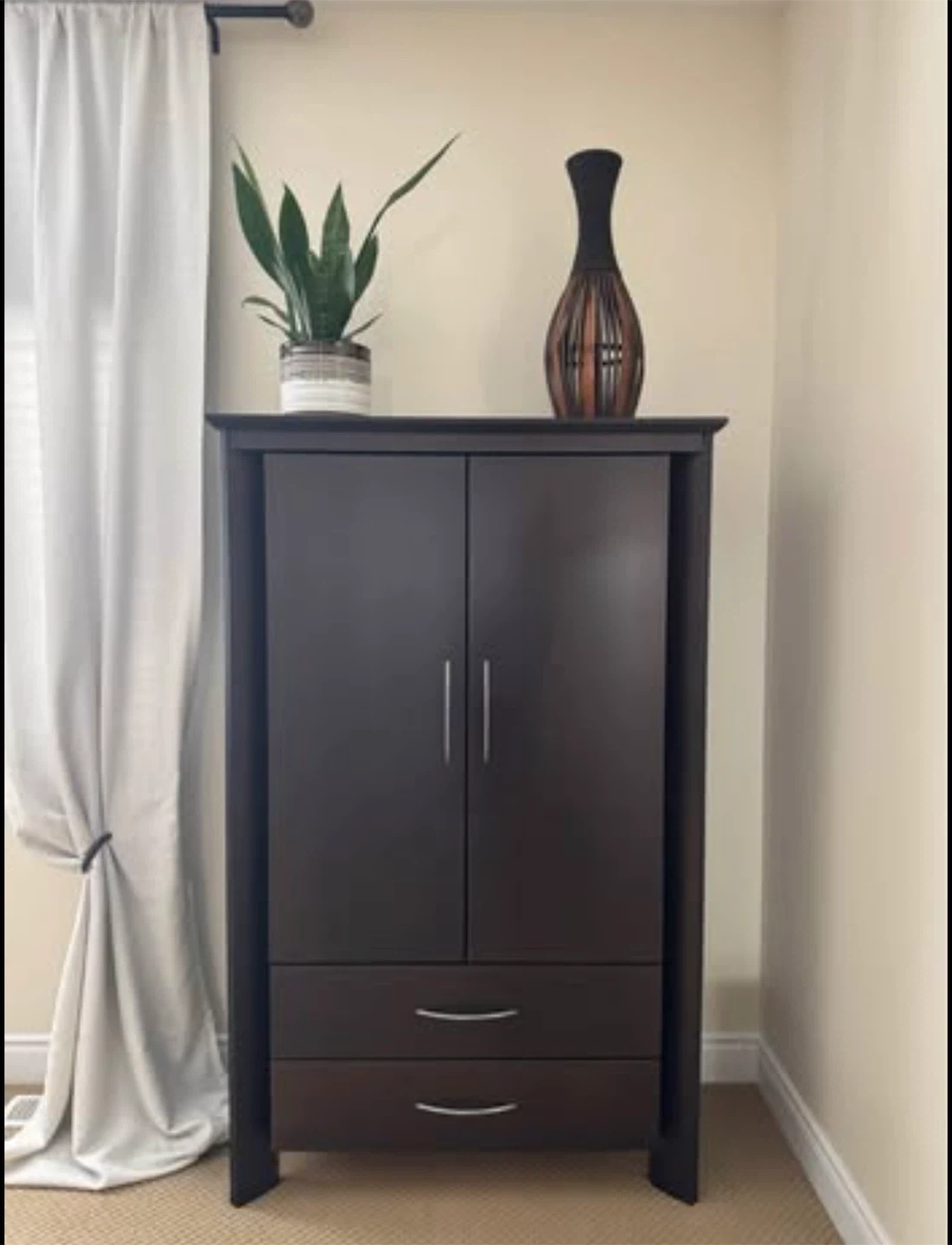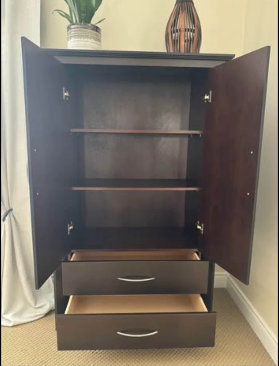 Beautiful dark wood bedroom set in excellent condition. Includes: • Queen Bed Frame with stylish headboard and low footboard (bonus: mattress base) • Armoire/Wardrobe with 2 drawers and interior shelving • 6-Drawer Dresser (wide, lots of storage) • 2 Matching Nightstands with drawers Made in Canada by Meuble Laurier (Québec) — known for quality craftsmanship, built to last. Comparable Canadian-made sets retail new for $3,000–$5,000+.” Modern, sleek design with brushed silver handles. Solid and sturdy construction. Perfect for a full bedroom upgrade. Condition: gently used, well cared for (see photos). 💰 Selling the entire set together. $ photos above bed and accessories sold separately (not included) $ mattress sold separately Measurements: Armoire: 18 1/4” D × 41 1/4” W × 66” H Dresser: 18 1/4” D × 68” W × 32” H Night stand: (x2): 17” D × 26” W × 23 3/4” H Bed Frame (Queen): 88” L × 63 1/2” W × 45 1/4” H PICKUP ONLY CASH SOLD AS A SET 1350 OBO