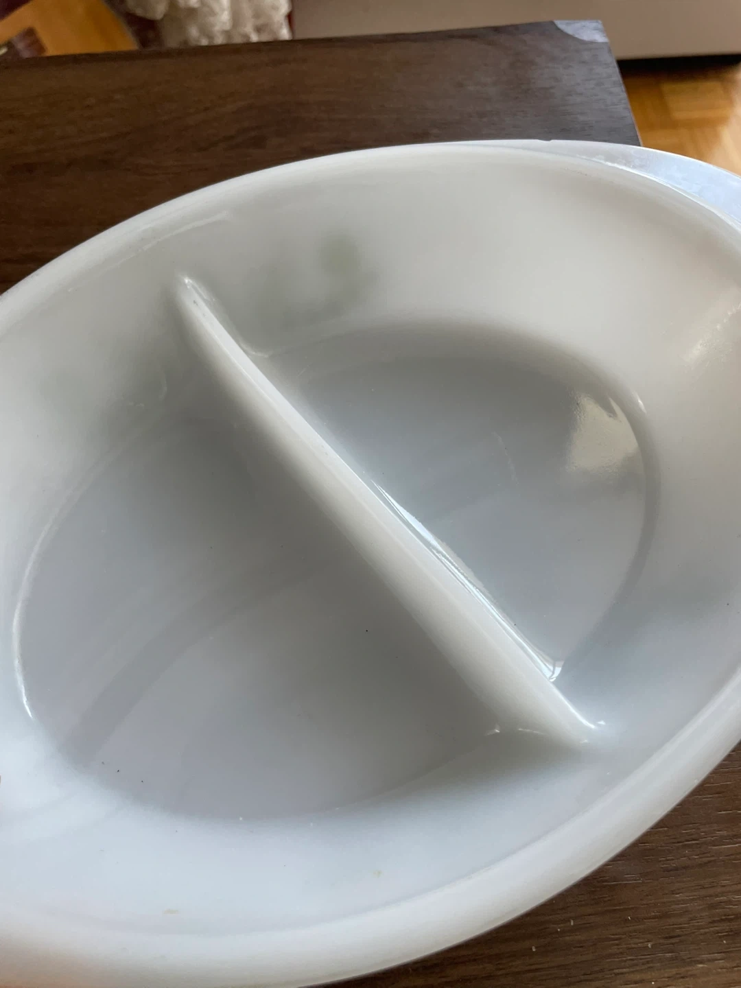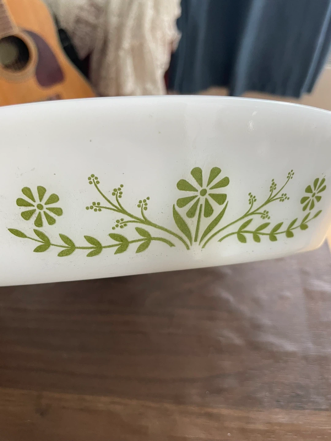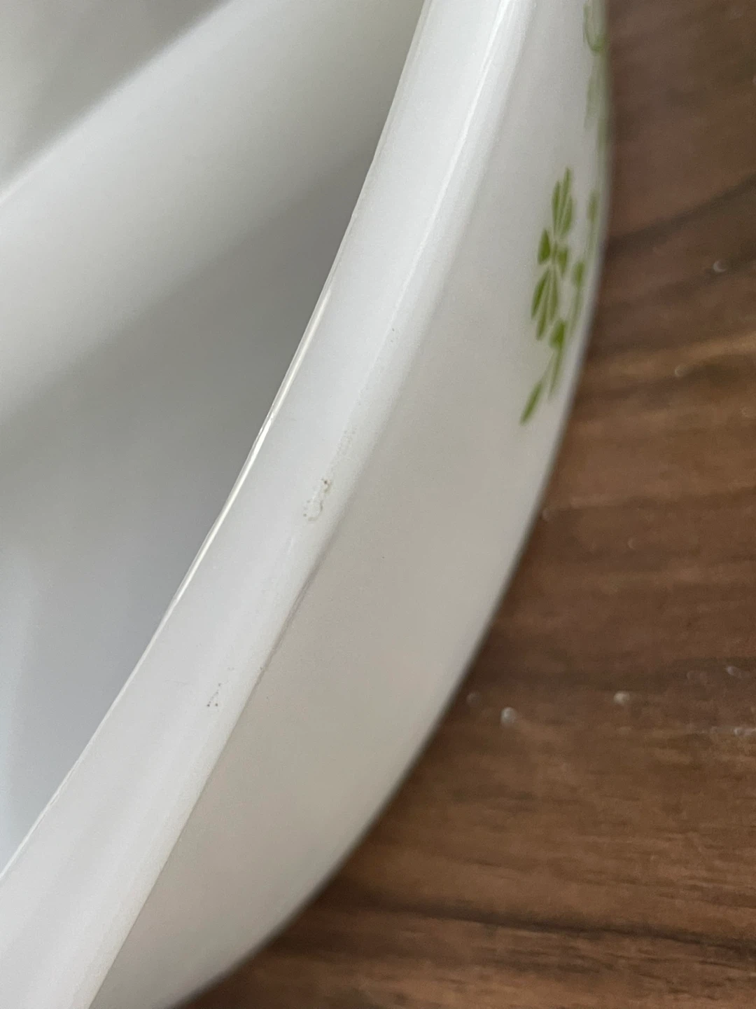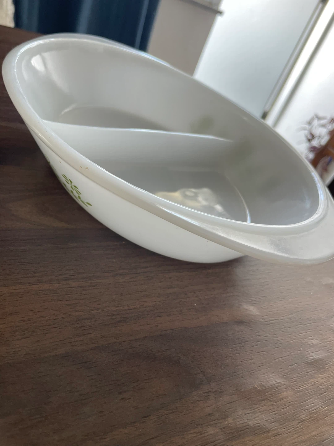 vintage Glassbake divided serving dish. White and features a lovely green floral daisy design. Perfect for serving snacks or appetizers at your next gathering Good condition with a small chip in the rim as pictured Pick up near Yonge and eglinton