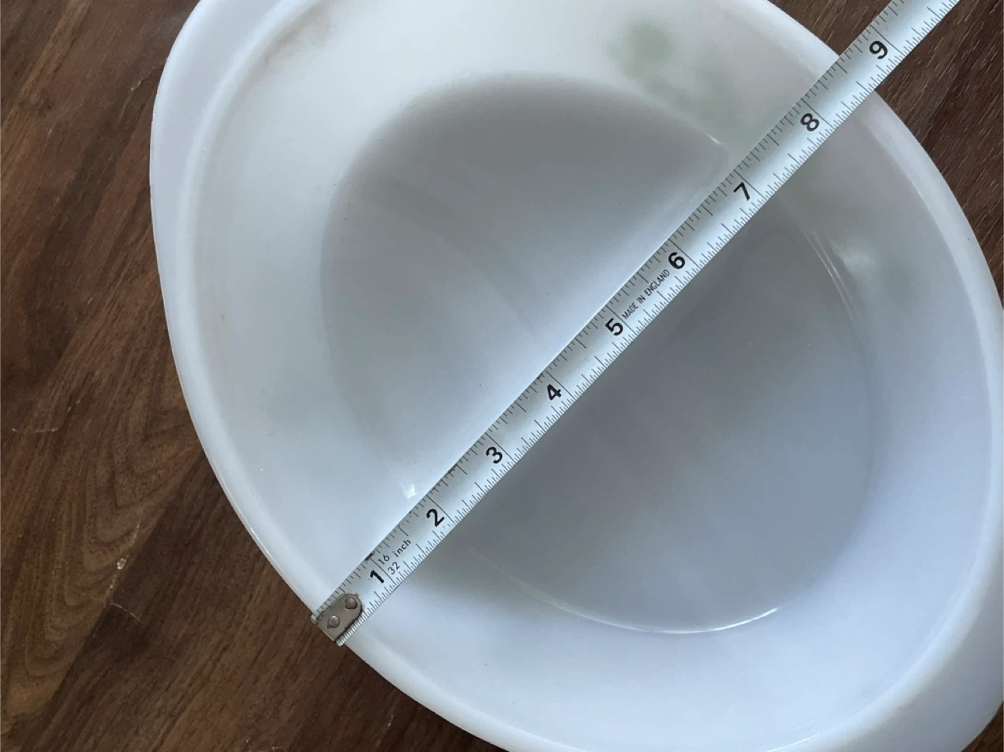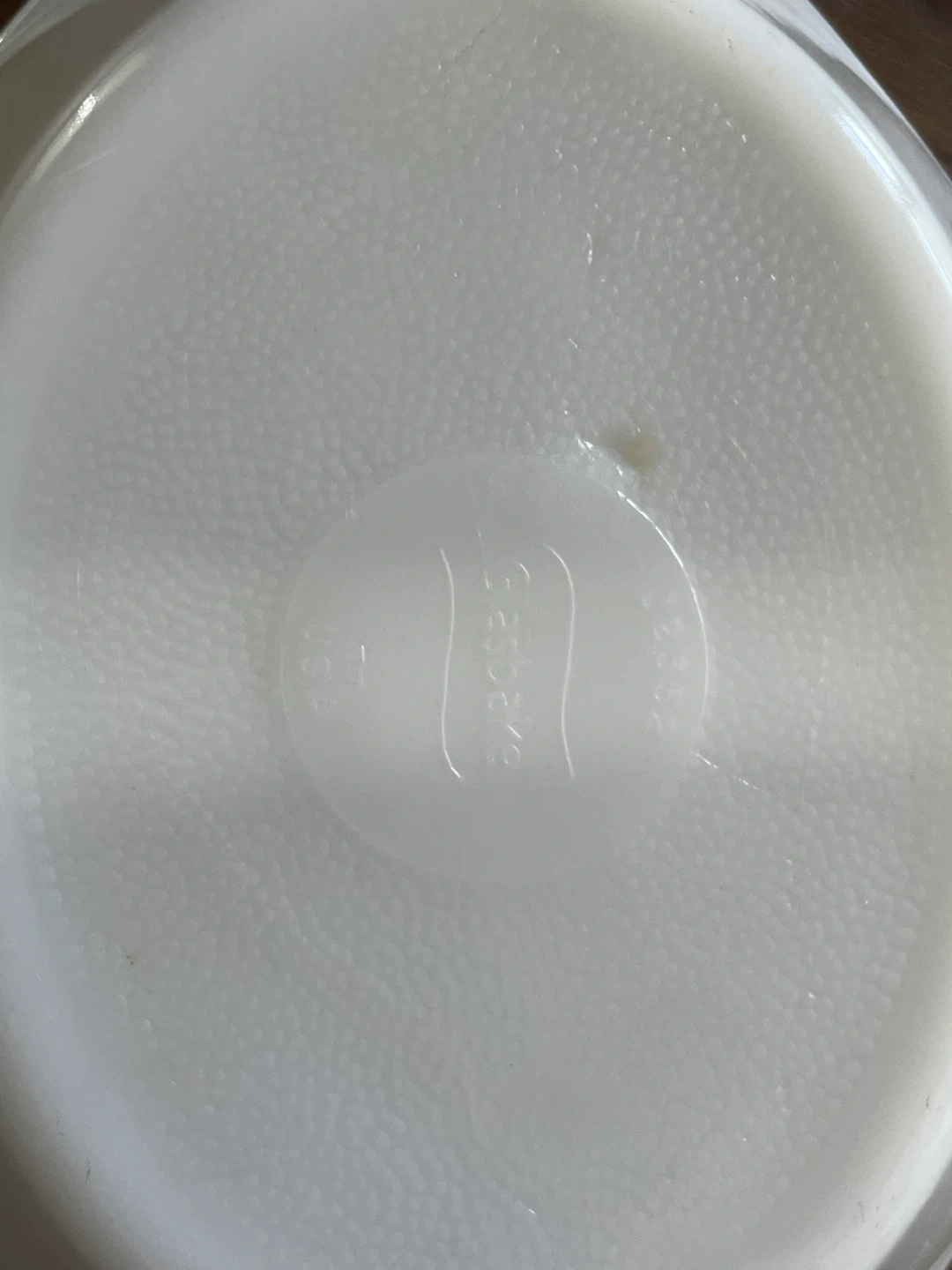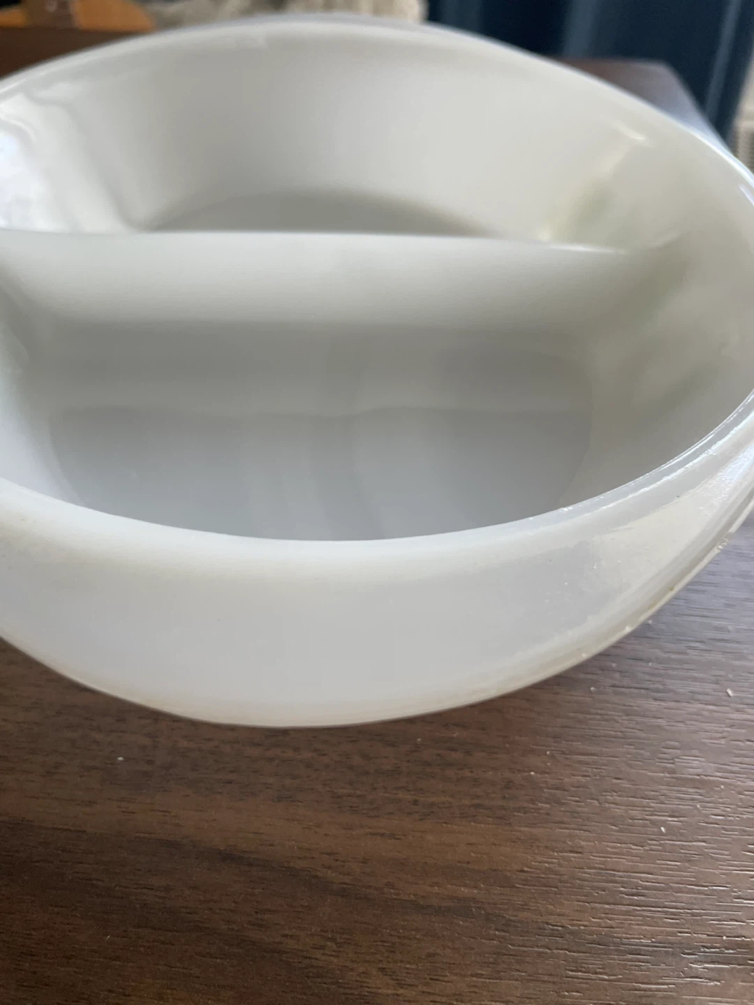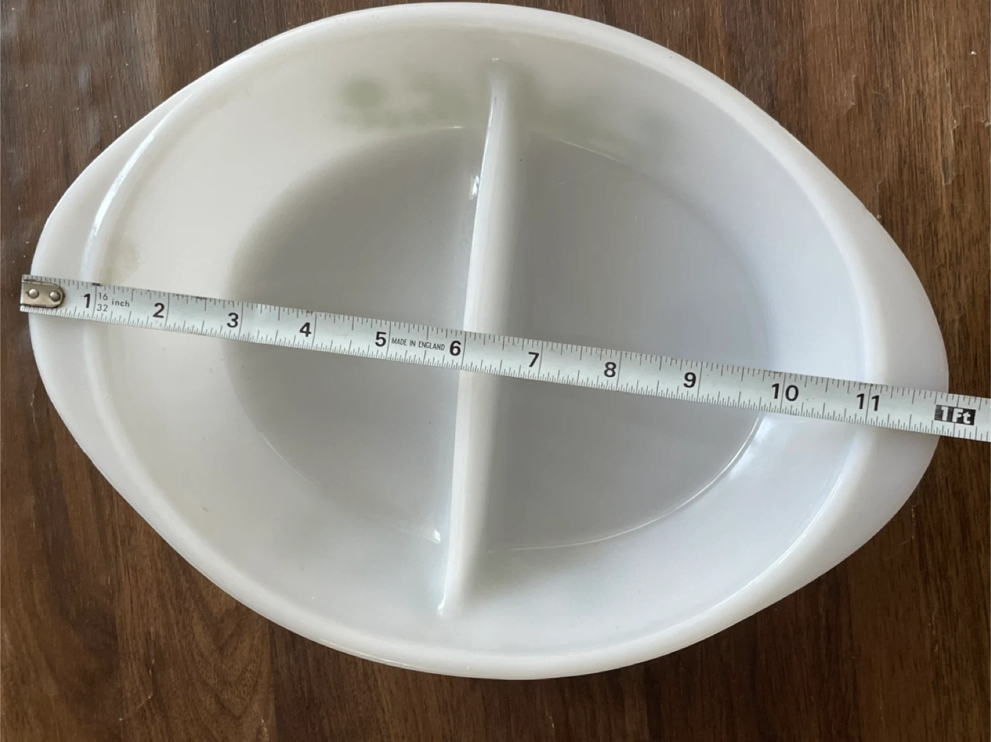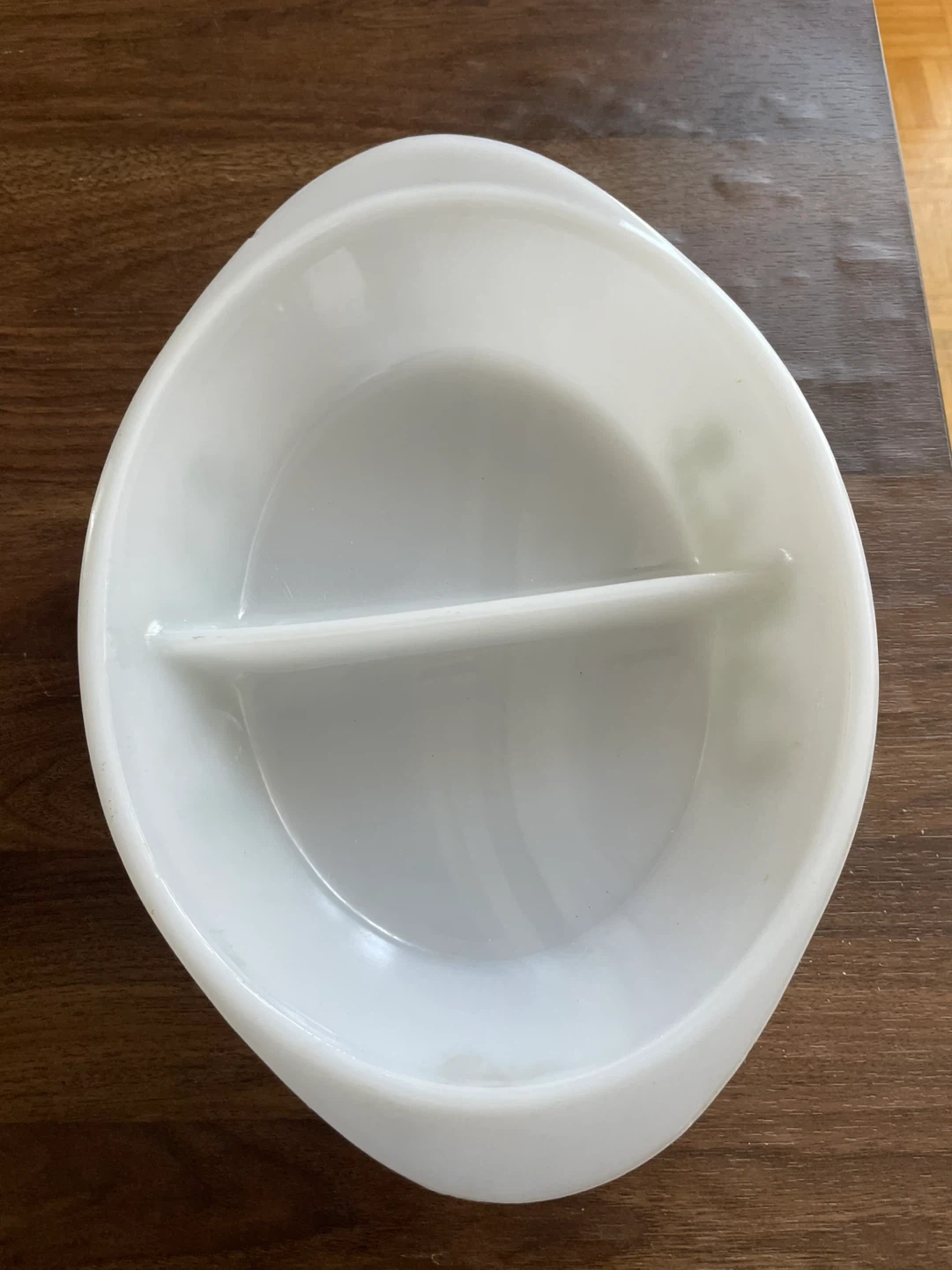 vintage Glassbake divided serving dish. White and features a lovely green floral daisy design. Perfect for serving snacks or appetizers at your next gathering Good condition with a small chip in the rim as pictured Pick up near Yonge and eglinton