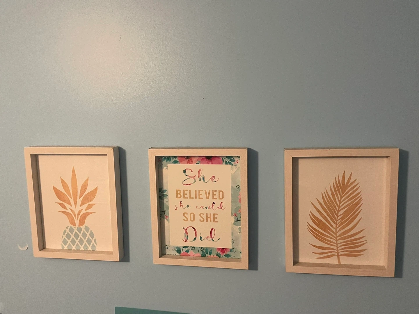 Selling a set of three framed wall art pieces. They feature a pineapple, a palm leaf, and a motivational quote. Perfect for adding a touch of tropical charm to any room!