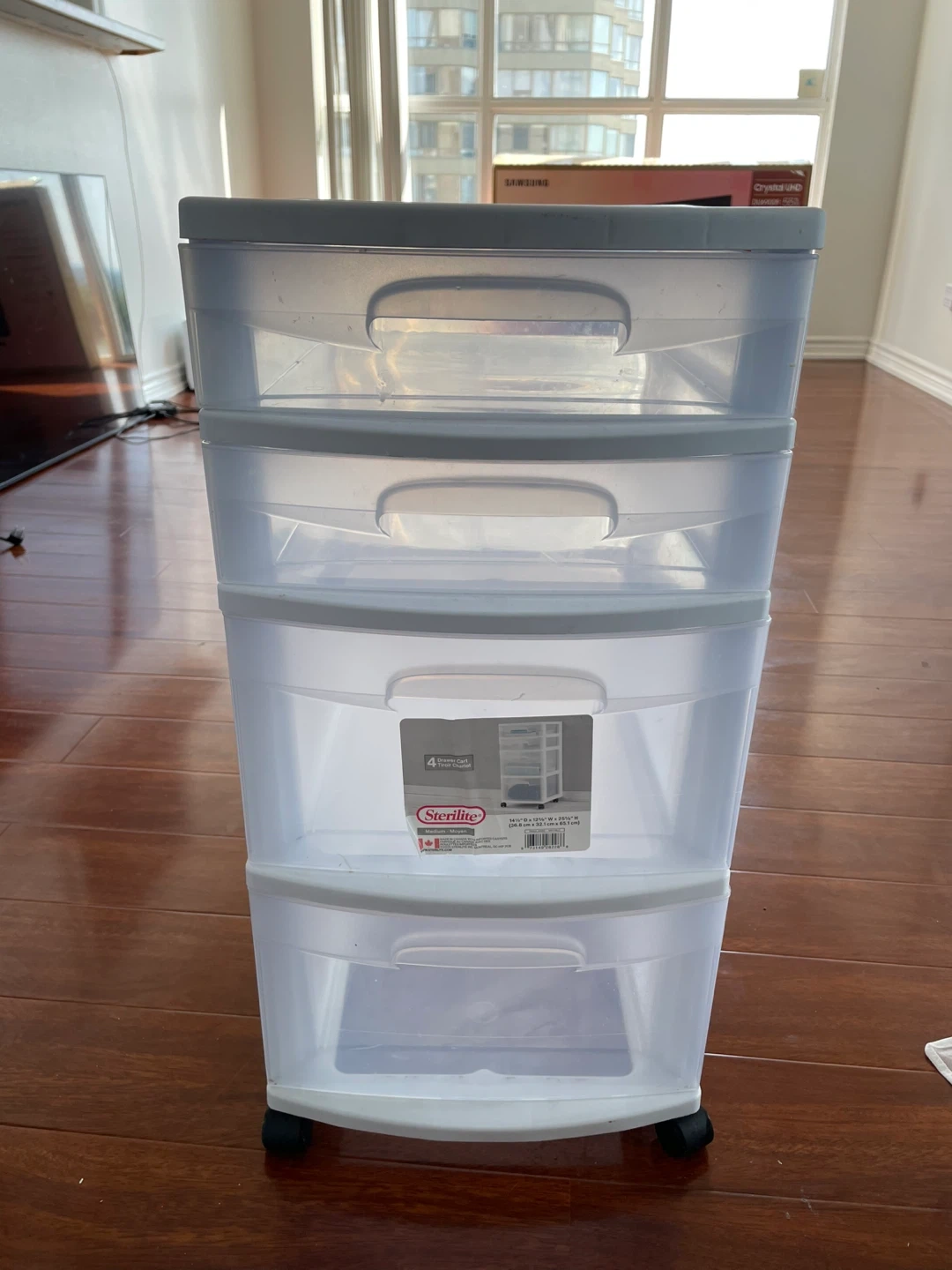Selling a Sterilite 4-drawer wide cart in white! It's great for organizing and storing items around the house. The cart has four drawers and is on wheels, making it easy to move around. Perfect for a bedroom, closet, or office!