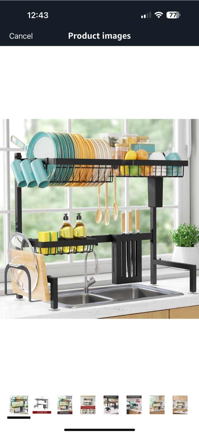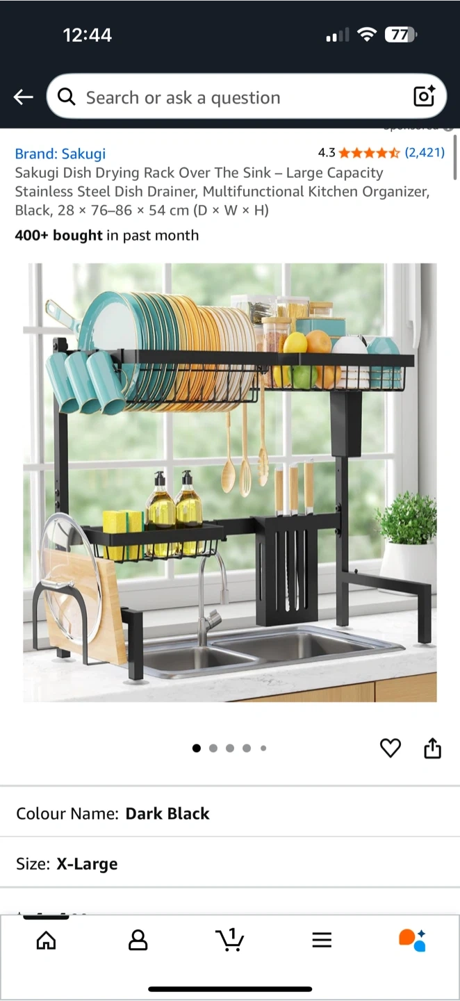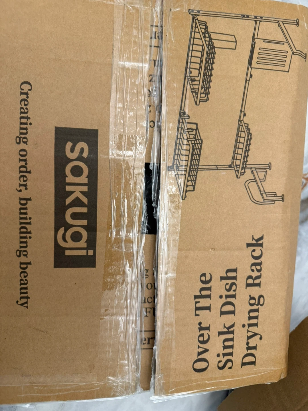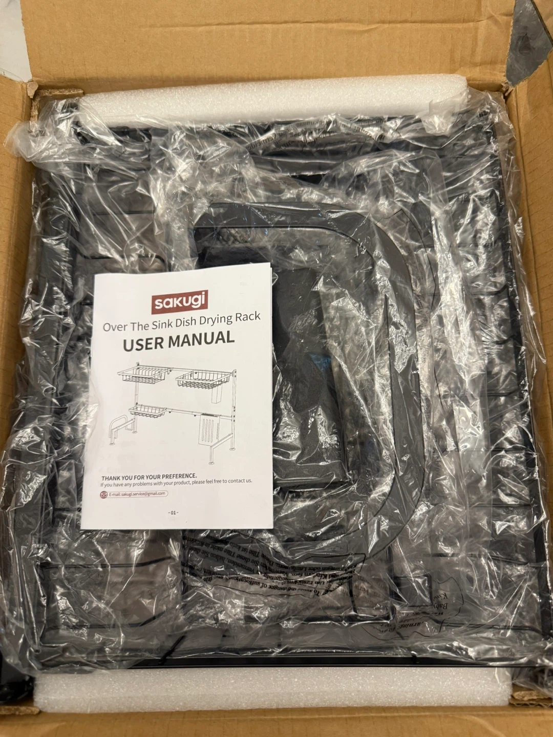 Selling a Sakugi over-the-sink dish drying rack in dark black, size X-Large. It's a stainless steel dish drainer and multifunctional kitchen organizer. It's still in its original box and includes the user manual!