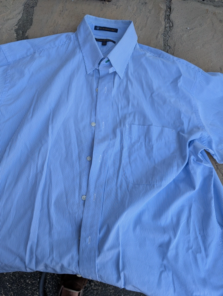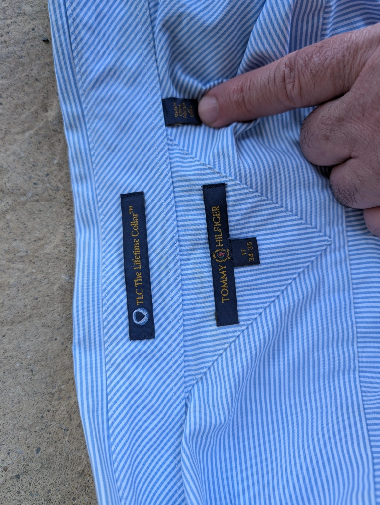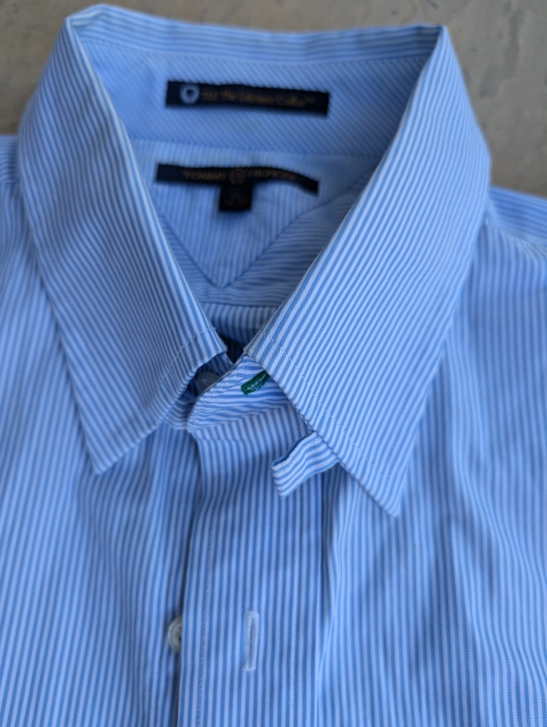 Tommy Hilfiger dress shirt in a light blue and white stripe pattern. It's a size 17 with a 34/35 sleeve length. Features "TLC The Lifetime Collar".
