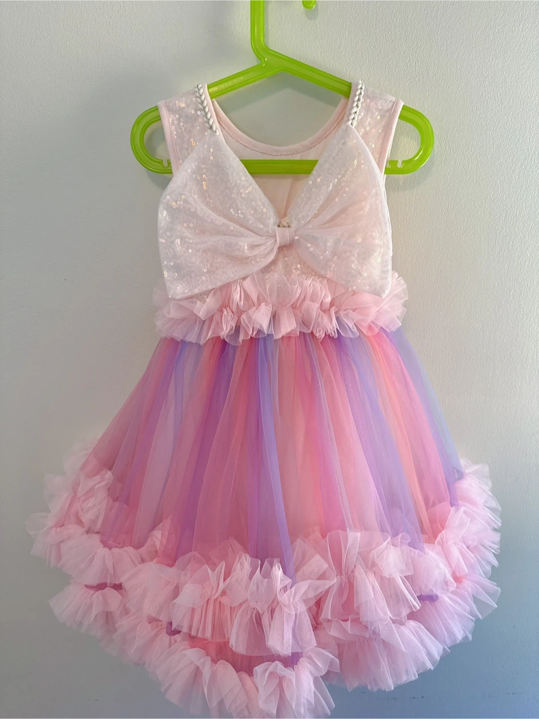 This adorable dress is perfect for parties or special occasions! It features a sparkly bodice and a colourful tulle skirt with layers of ruffles. 100% Cotton inner layer, sensitive skin friendly.