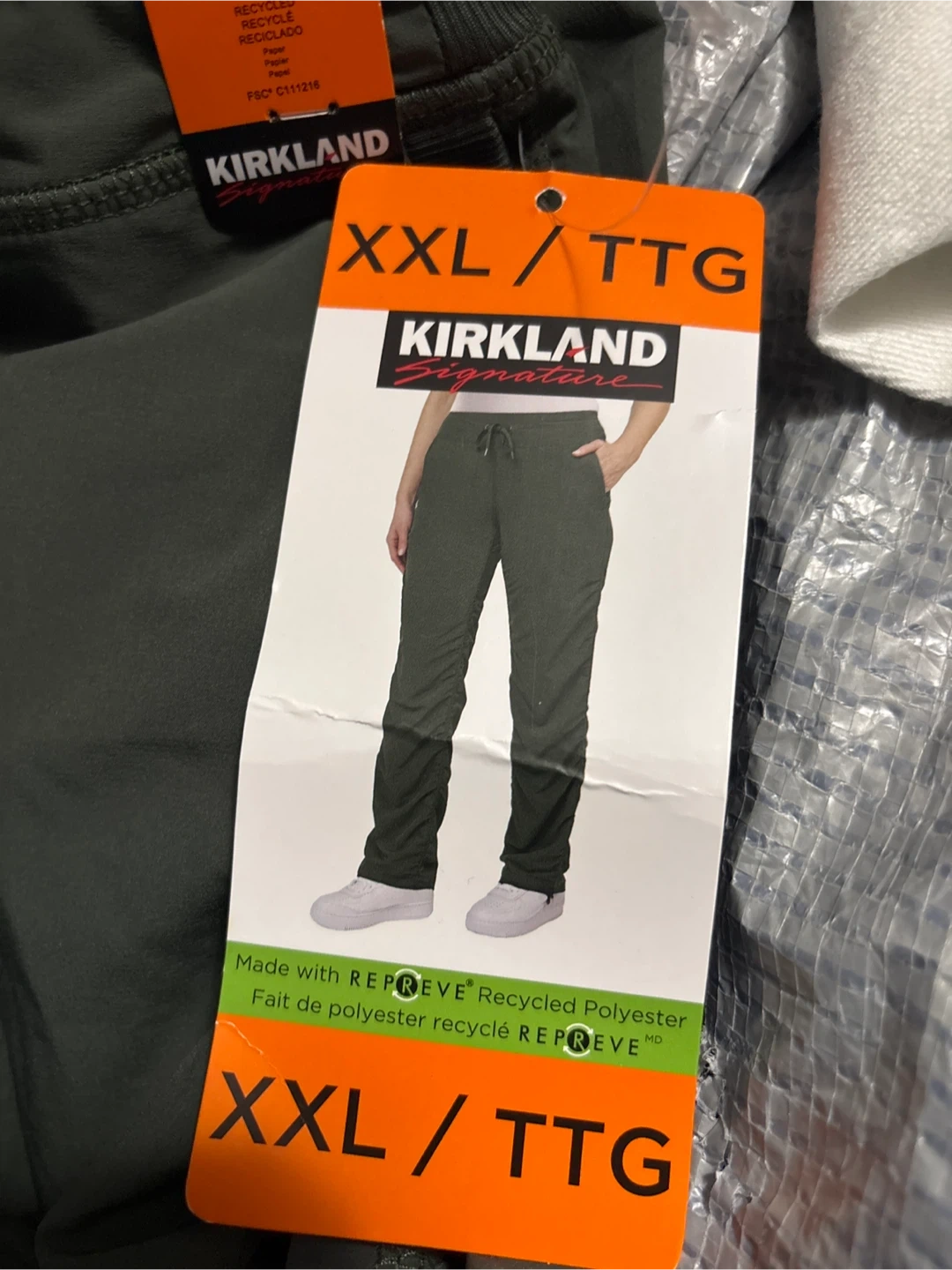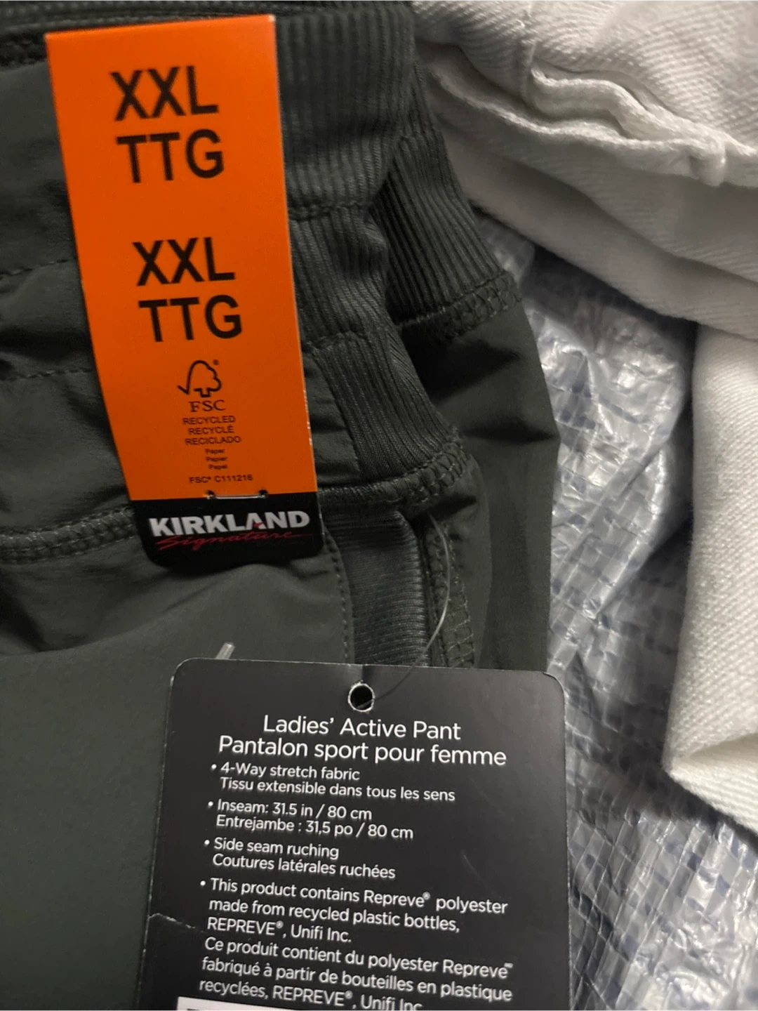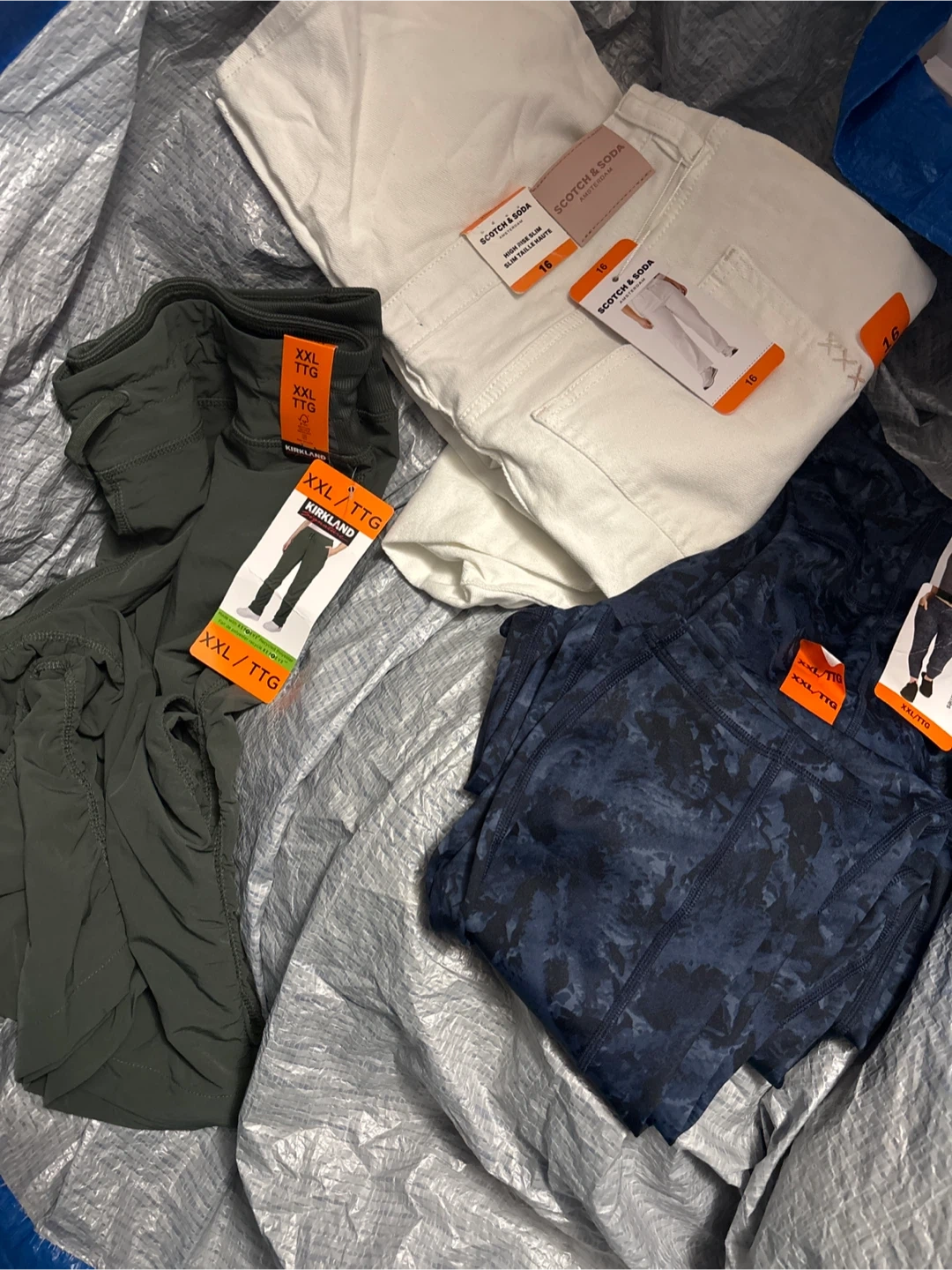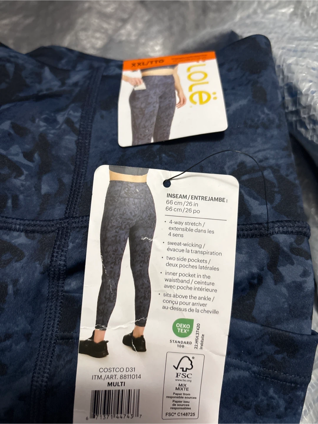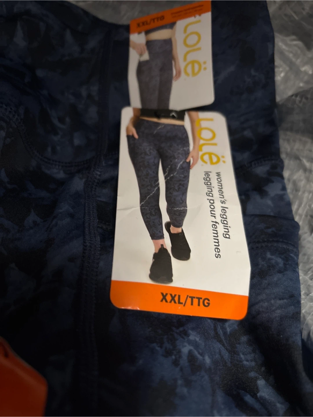 $10 each Lolë women's leggings in size XXL! These leggings feature a stylish pattern and are perfect for workouts or everyday wear. They have a 4-way stretch, are sweat-wicking, and have two side pockets, plus an inner pocket in the waistband. Super comfy and ready for a new home, Kirkland active pant green size XXL and Scotch & Soda white jeans size 16