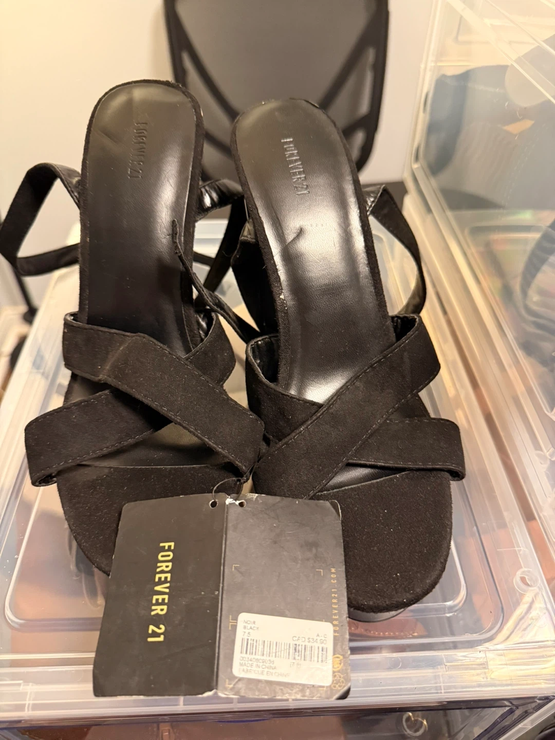 Selling a pair of black heels from Forever 21! They're in great condition and ready for a new home. Some we new brand and some are used ones sizes 6 and 7. Each for $20 but if you buy 2 pairs then you can get $15 each and a free shoe storage. AS-IS.