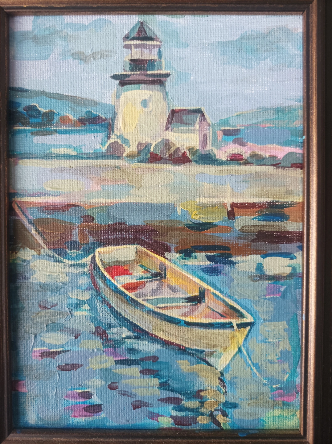 A lovely framed painting featuring a boat and lighthouse scene. The colours are really calming and would look great in any room This picture oil painting on canvas board.