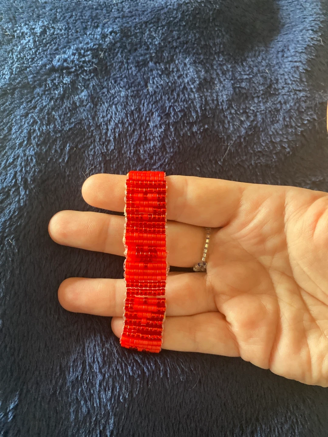Selling a cute red beaded bracelet. It's in great condition and would make a lovely addition to any outfit! The beads are bright and shiny, and it's comfortable to wear