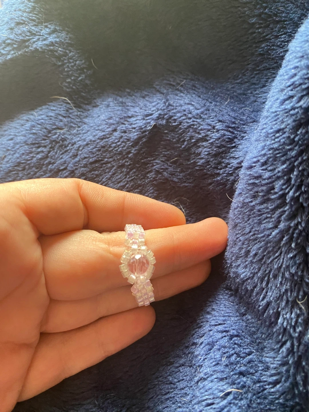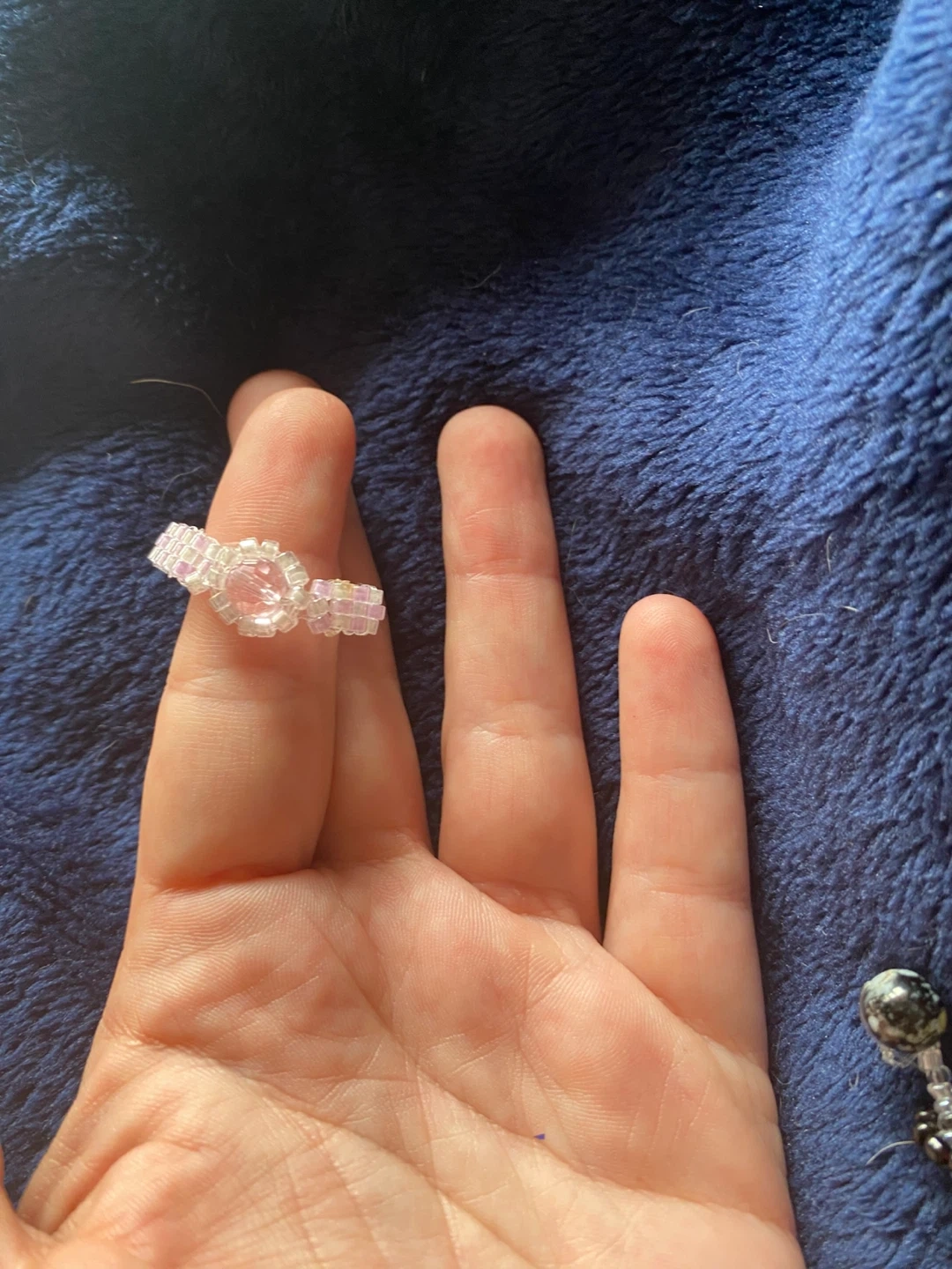 Selling a cute handmade beaded ring! It features a heart-shaped bead in the centre, surrounded by smaller white and iridescent beads. Perfect for adding a touch of whimsy to any outfit