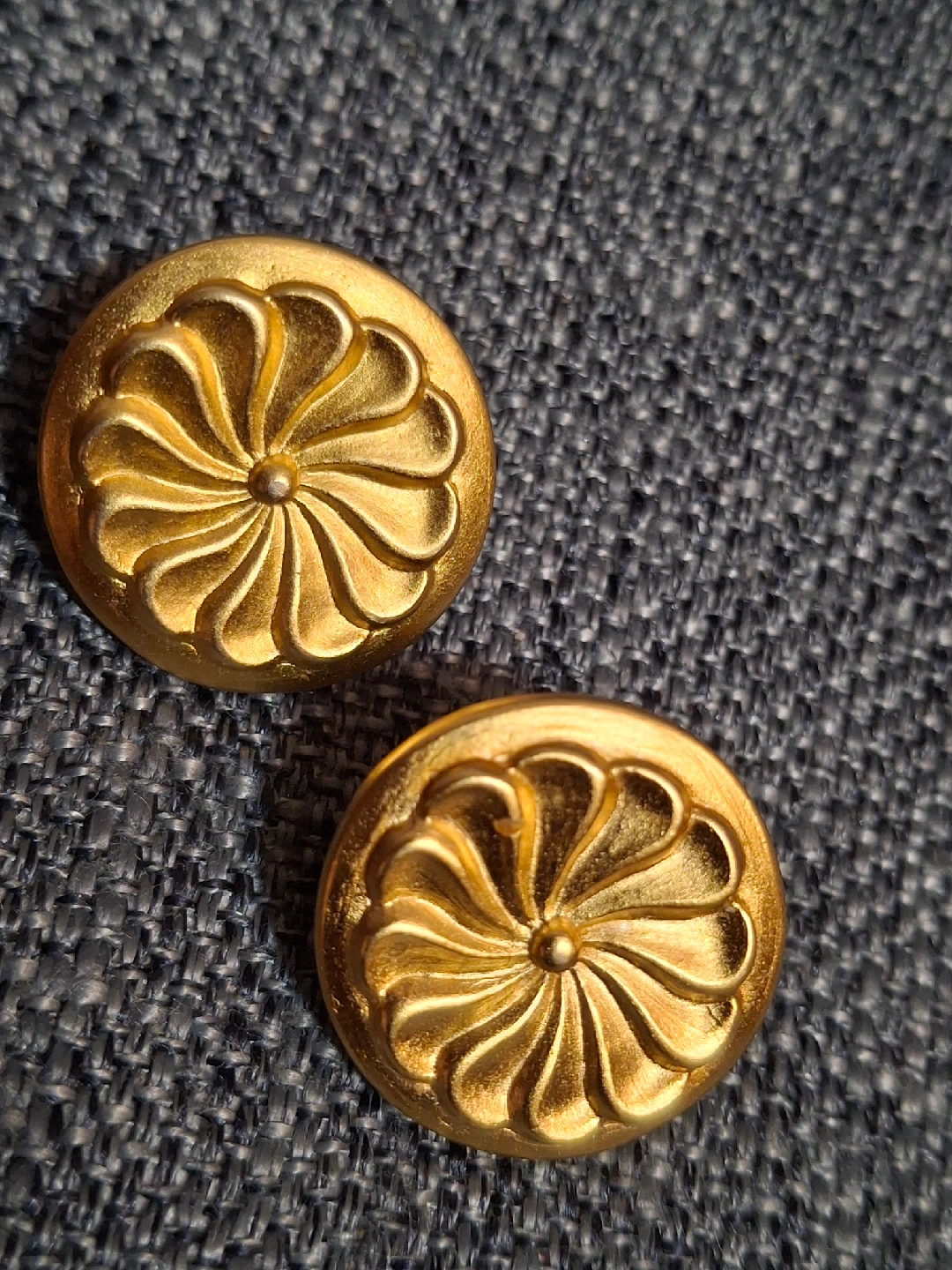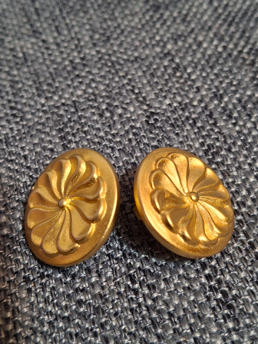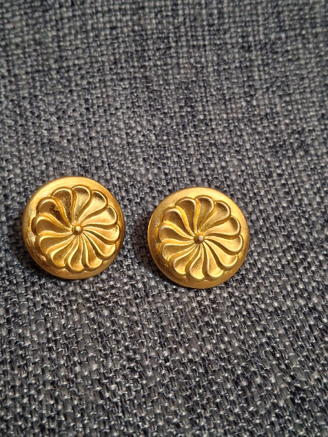 A pair of gold-toned earrings with a flower design. They have a post back and are in great condition!