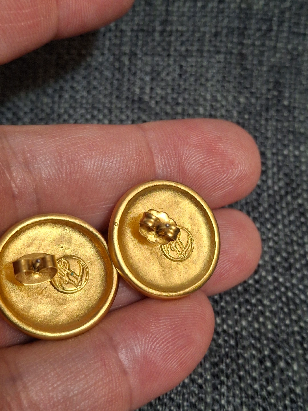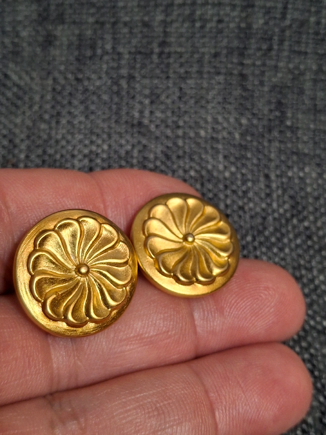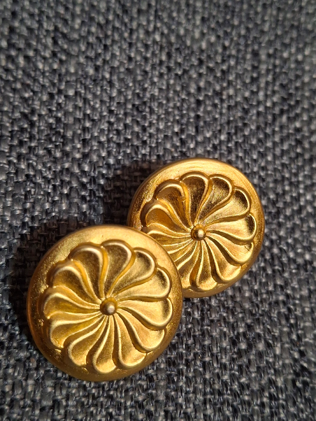 A pair of gold-toned earrings with a flower design. They have a post back and are in great condition!