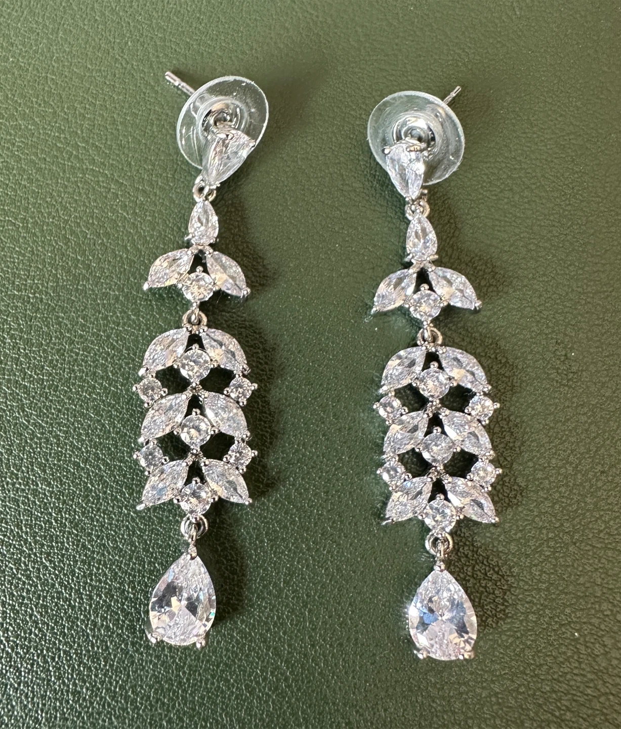 These are a pair of beautiful, elegant dangle earrings. They feature a lovely design with clear stones that catch the light. Perfect for dressing up any outfit! New - never worn