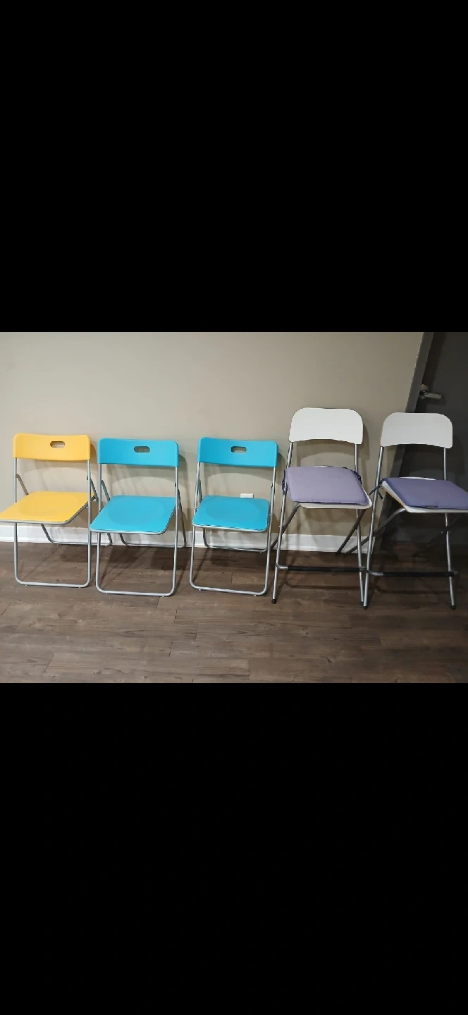 Selling a few folding chairs! There's one in yellow, two in blue, and two in white with purple cushions. They're perfect for extra seating when you have guests over, or for taking to events. They fold up easily for storage too! all for $35