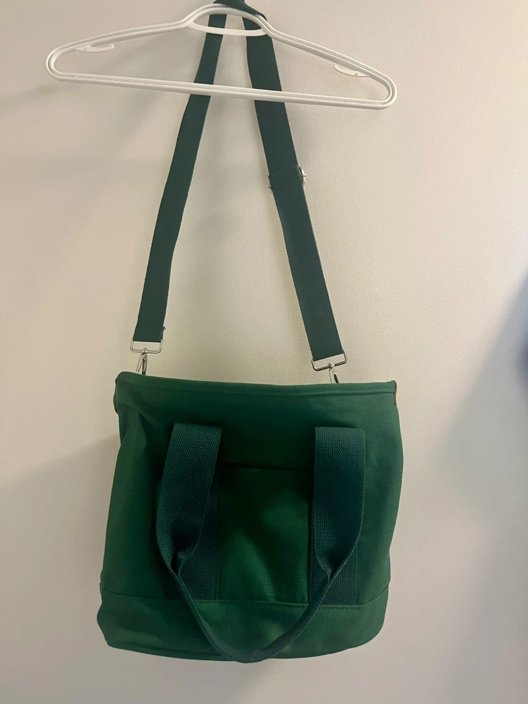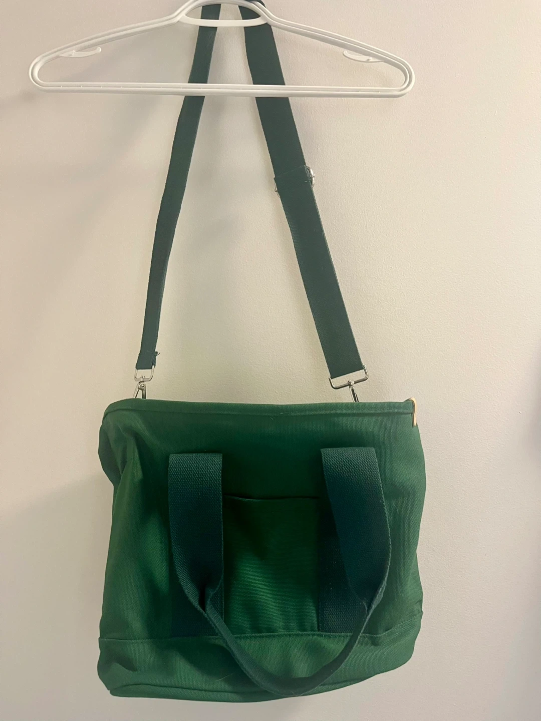 Looking to pass along this handy green canvas tote bag! It comes with both handles and a shoulder strap, making it super versatile. It has a zippered closure and a few pockets inside to keep things organized. Perfect for groceries, books, or everyday essentials Pickup downtown and cash only !