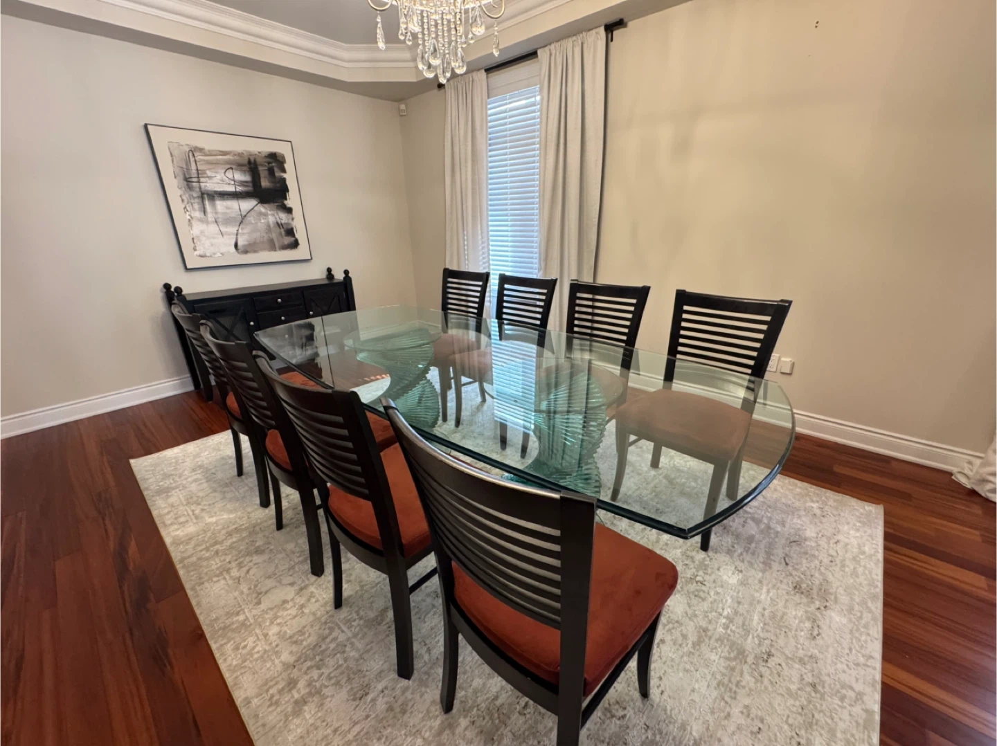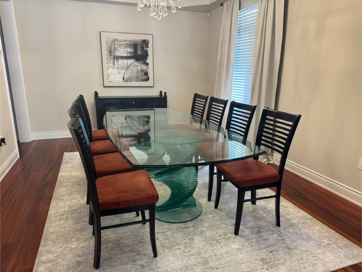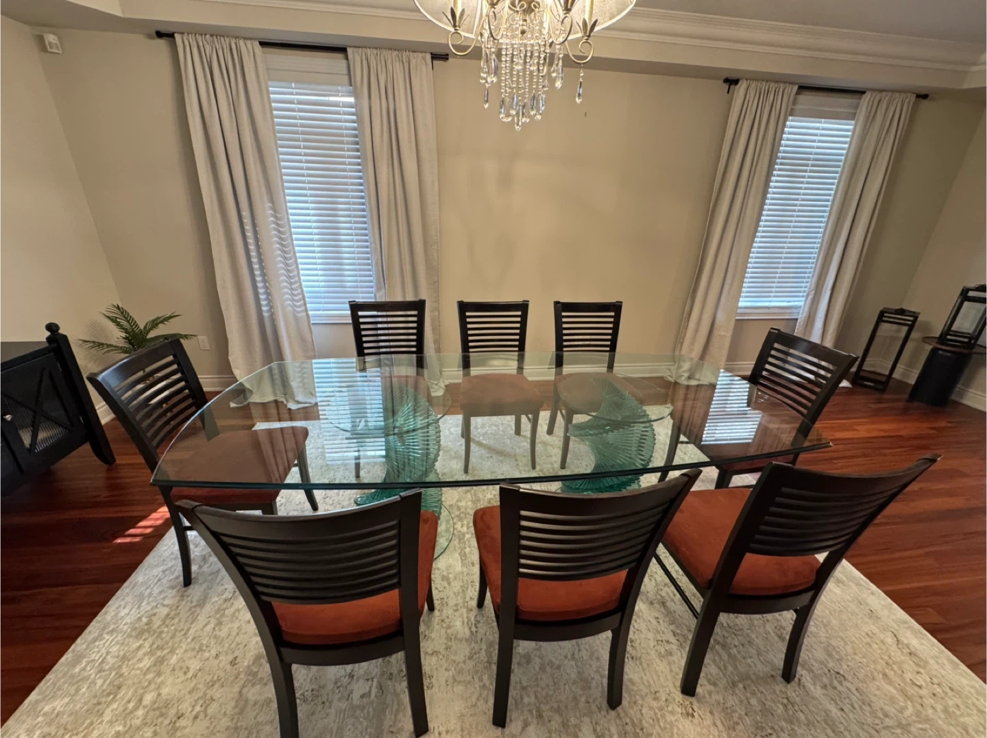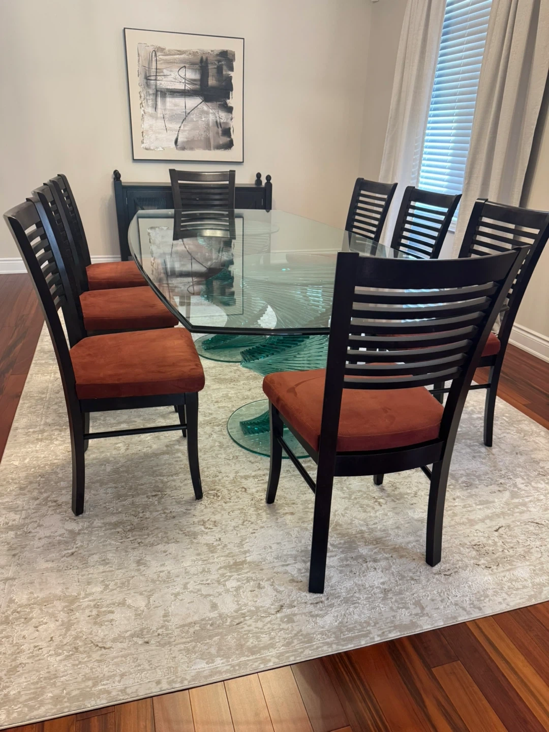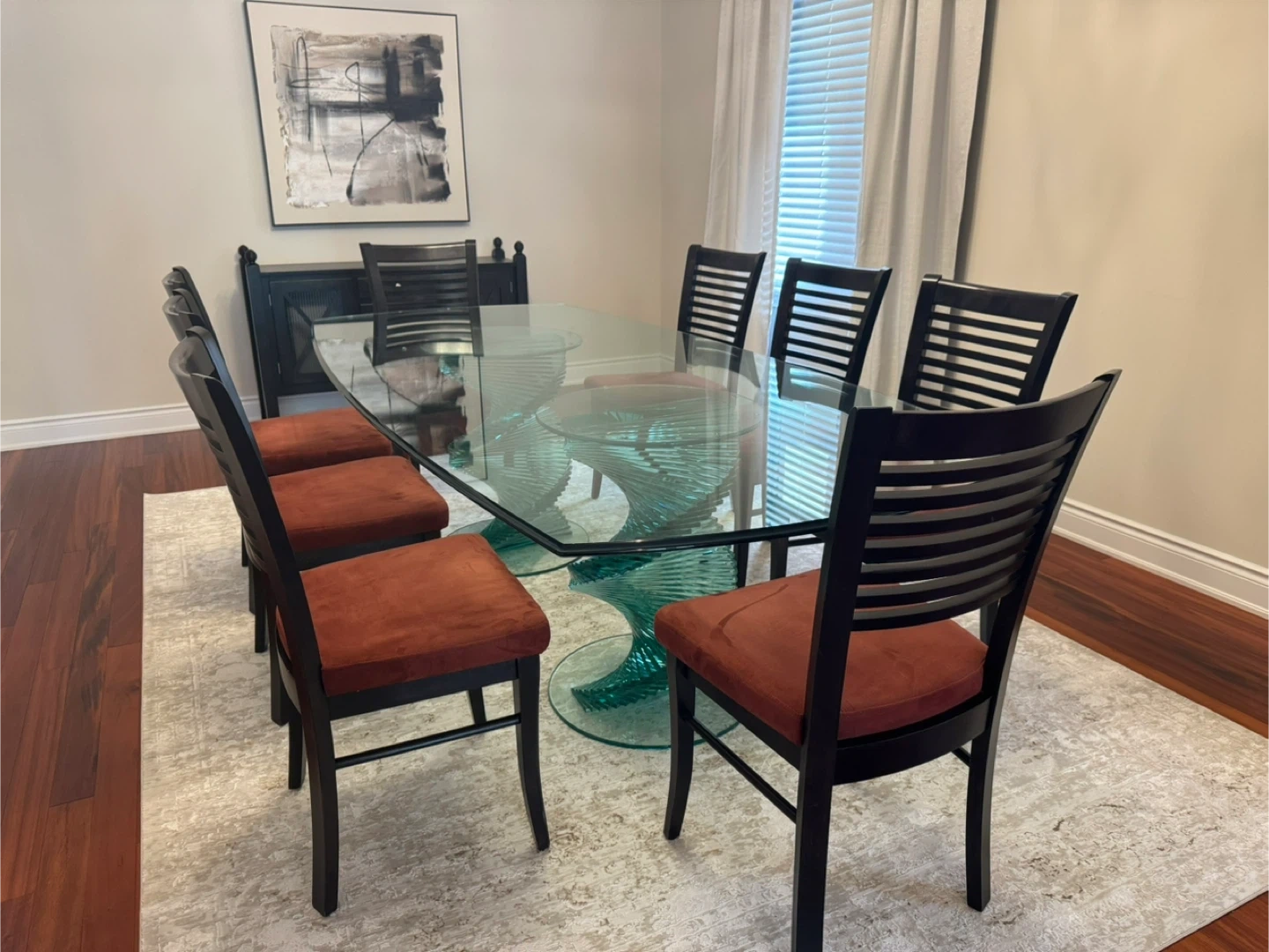 Stunning oversized dining set that makes a statement in any home. • Table: Thick beveled glass top with unique spiral glass pedestal base (2 - 20” wide pedestals). • Size: 101 ¼” L × 47 ½” W × 30” H • Chairs: 8 solid wood chairs with ladder backs and cushioned seats in a rust/burnt orange fabric. • Condition: Excellent, sturdy, gently used. • Style: Contemporary / modern – perfect for large families, entertaining, or a formal dining room. Seats 8 comfortably with room to spare. PICKUP ONLY – please bring help for transport, as the glass top is heavy. CASH ** table can be purchased without chairs ** chairs not sold separately