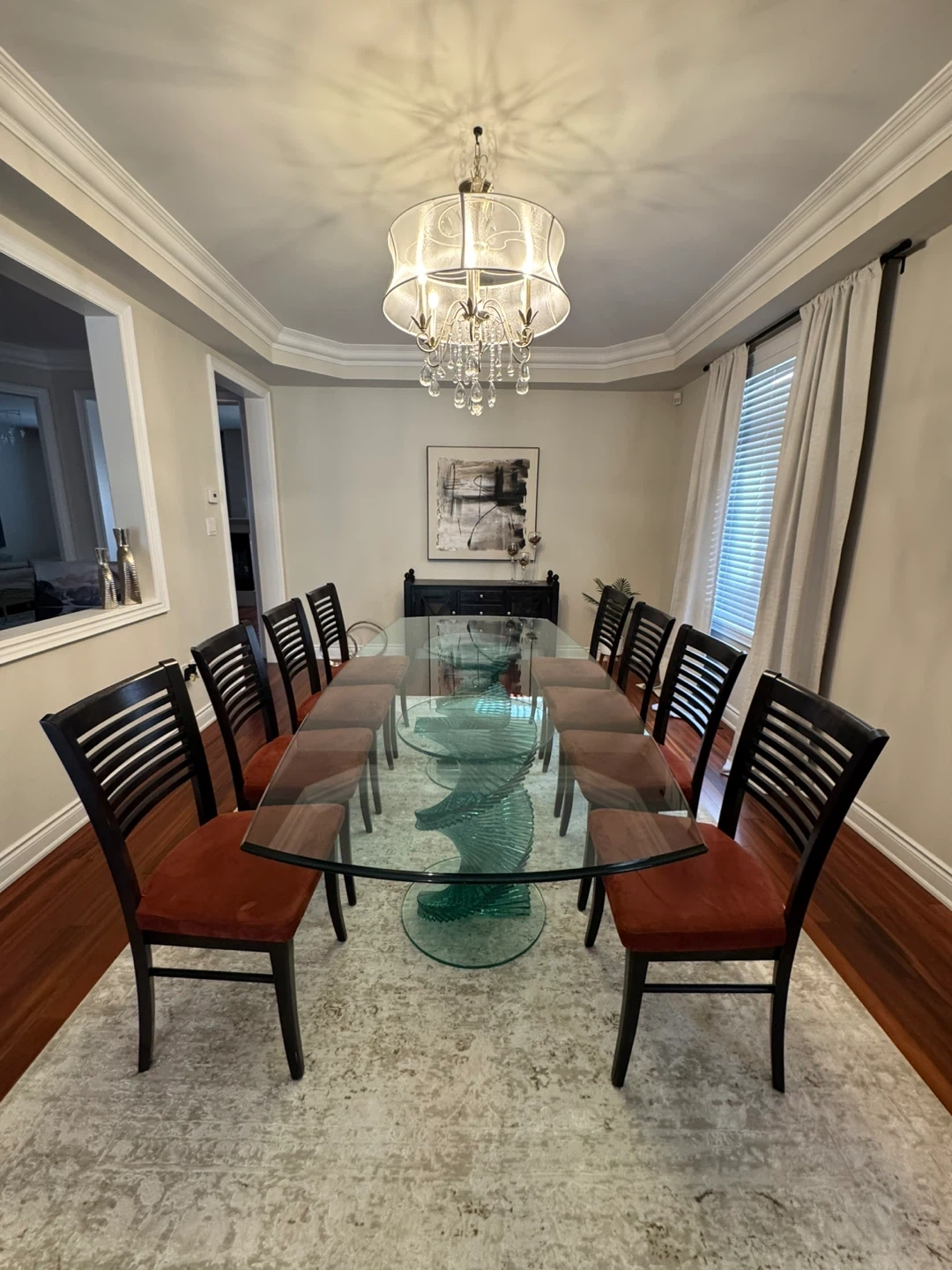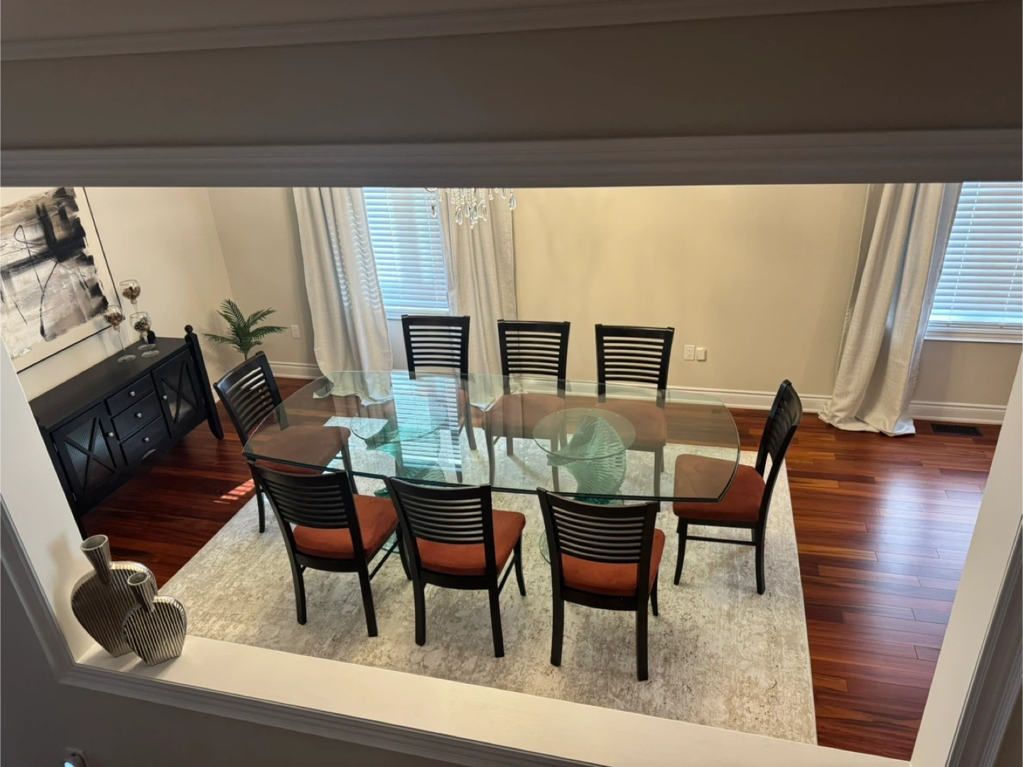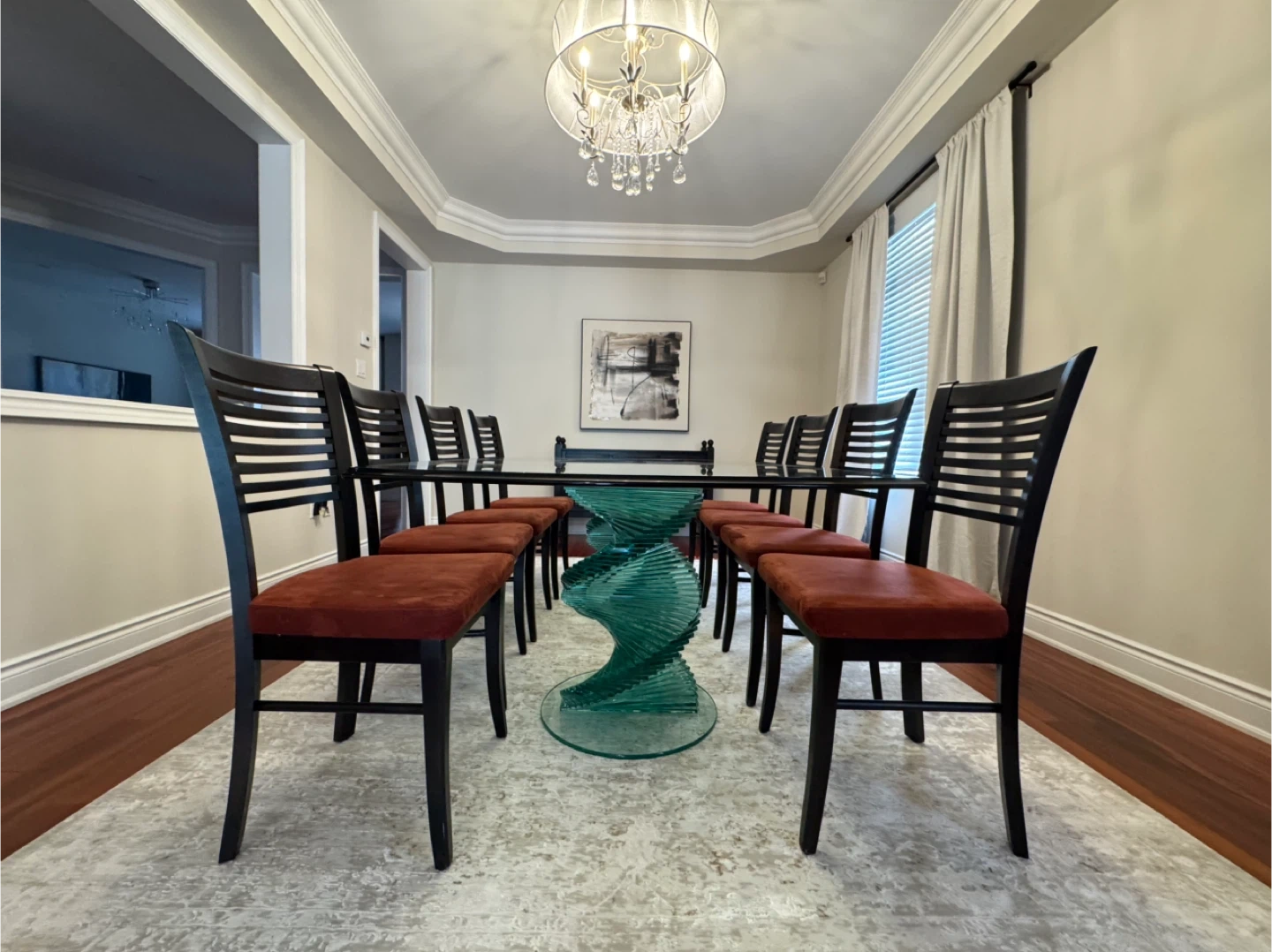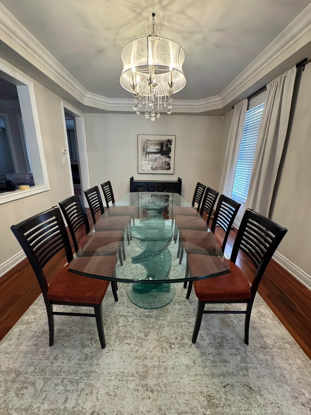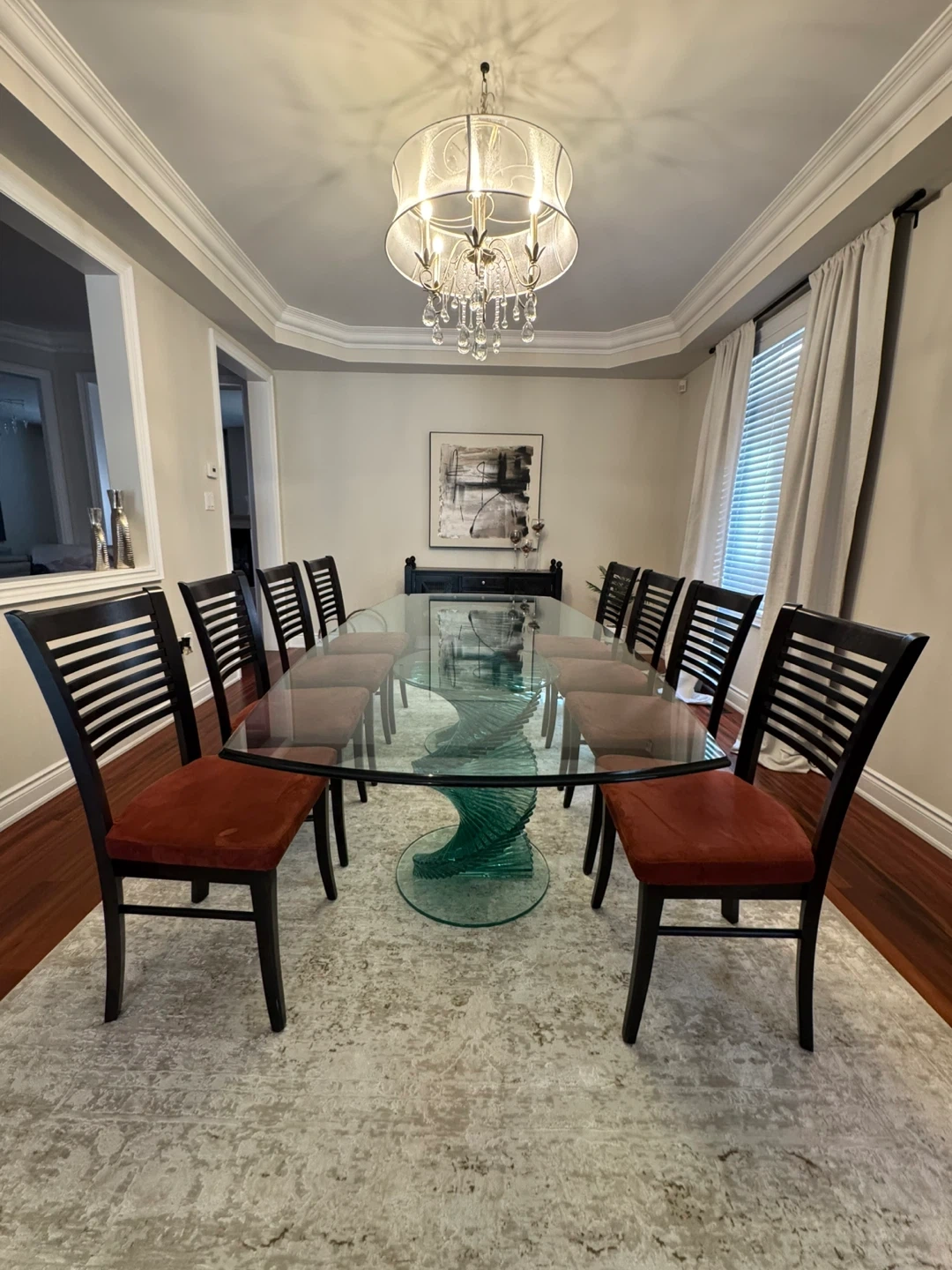 Stunning oversized dining set that makes a statement in any home. • Table: Thick beveled glass top with unique spiral glass pedestal base (2 - 20” wide pedestals). • Size: 101 ¼” L × 47 ½” W × 30” H • Chairs: 8 solid wood chairs with ladder backs and cushioned seats in a rust/burnt orange fabric. • Condition: Excellent, sturdy, gently used. • Style: Contemporary / modern – perfect for large families, entertaining, or a formal dining room. Seats 8 comfortably with room to spare. PICKUP ONLY – please bring help for transport, as the glass top is heavy. CASH ** table can be purchased without chairs ** chairs not sold separately