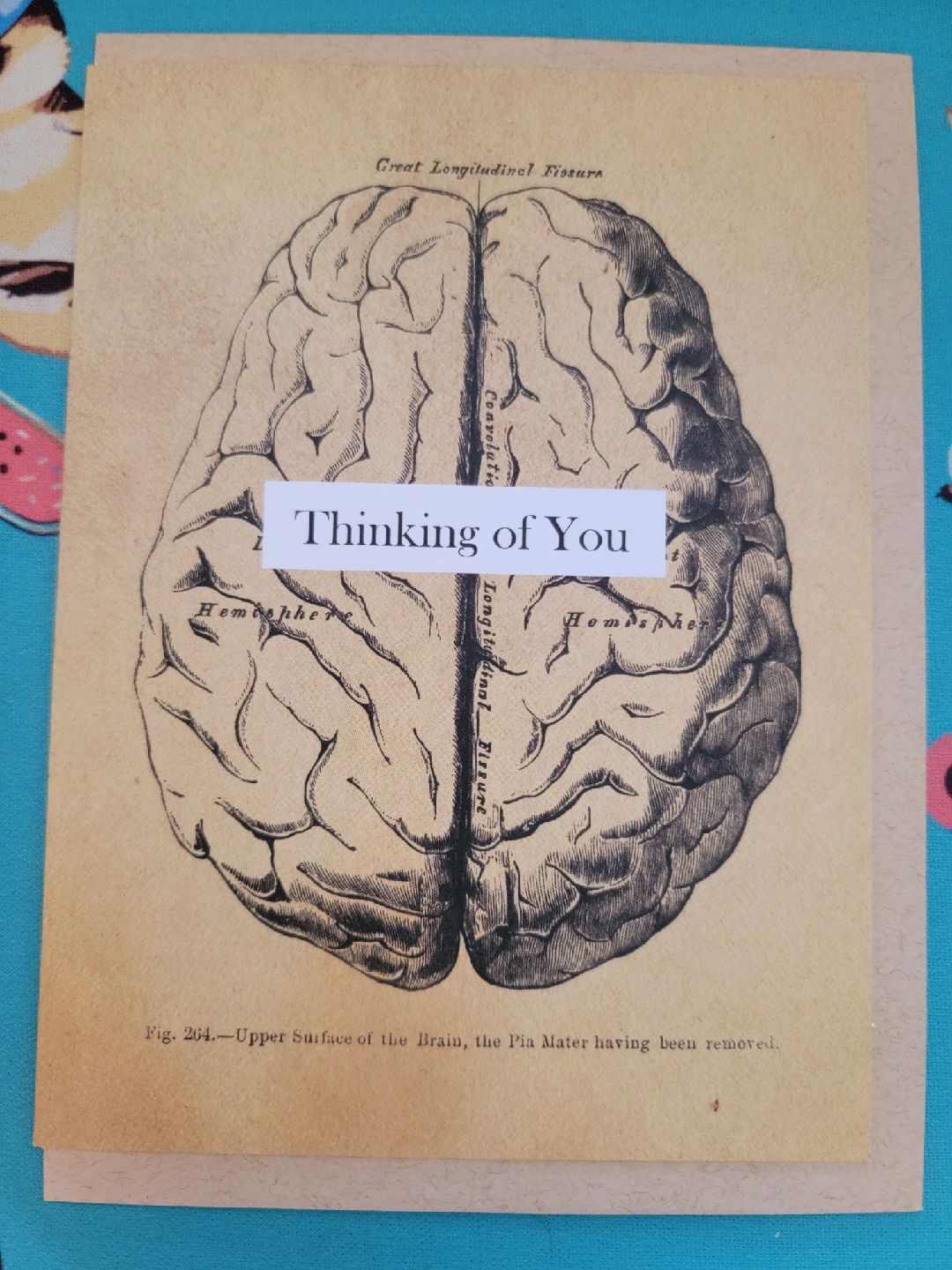 'Thinking of You' card featuring a brain illustration! The card is made from 100% recycled paper and comes with a matching envelope. Perfect for sending a thoughtful message to someone special. Blank Inside. Open to negotiating the price; please reach out. Thank you for taking a look at my listing! Have a wonderful day.