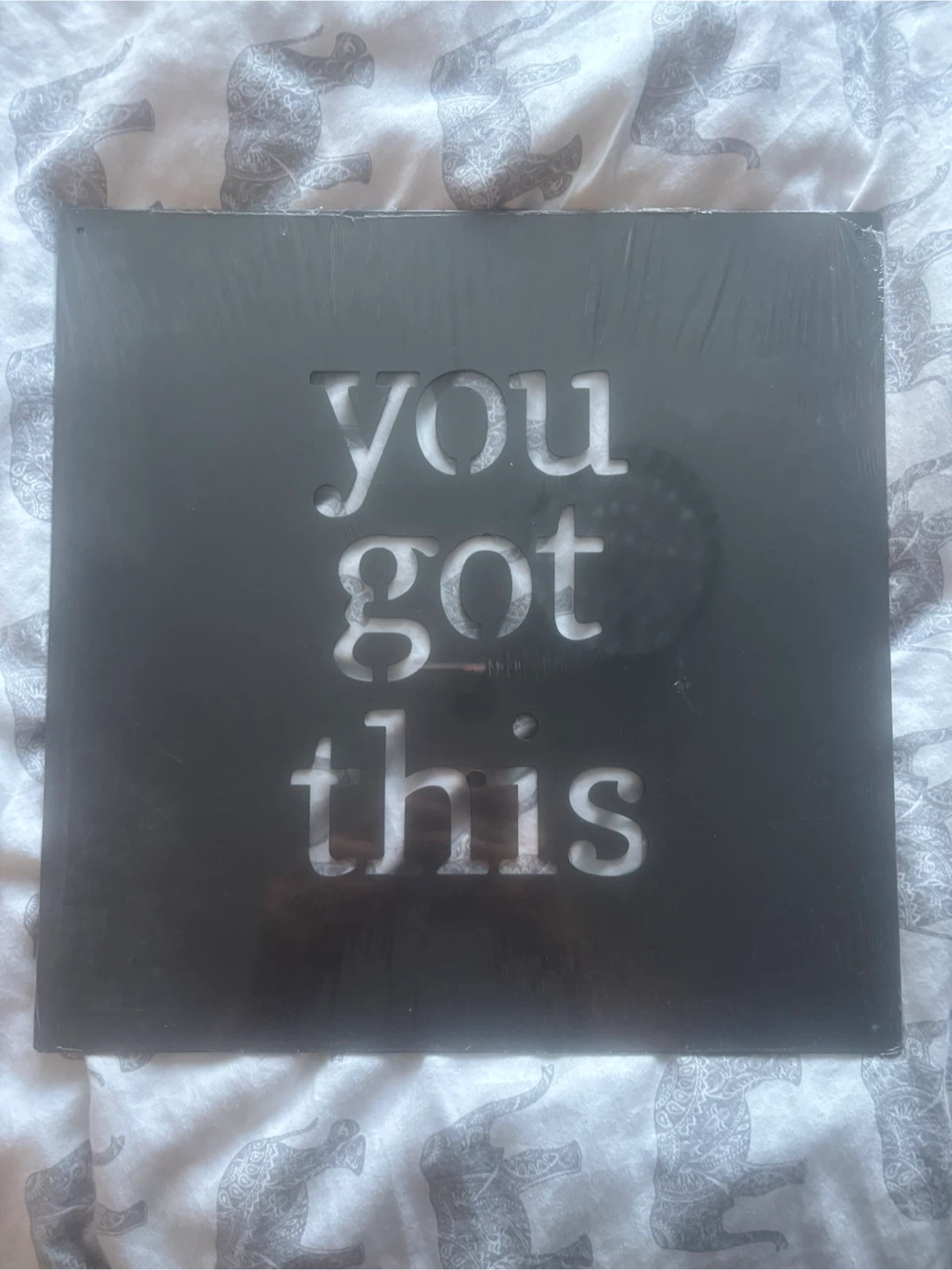 Selling a dark grey metal wall decor piece with the words "You Got This" cut out. It's new in plastic wrap and would be a nice addition to any room