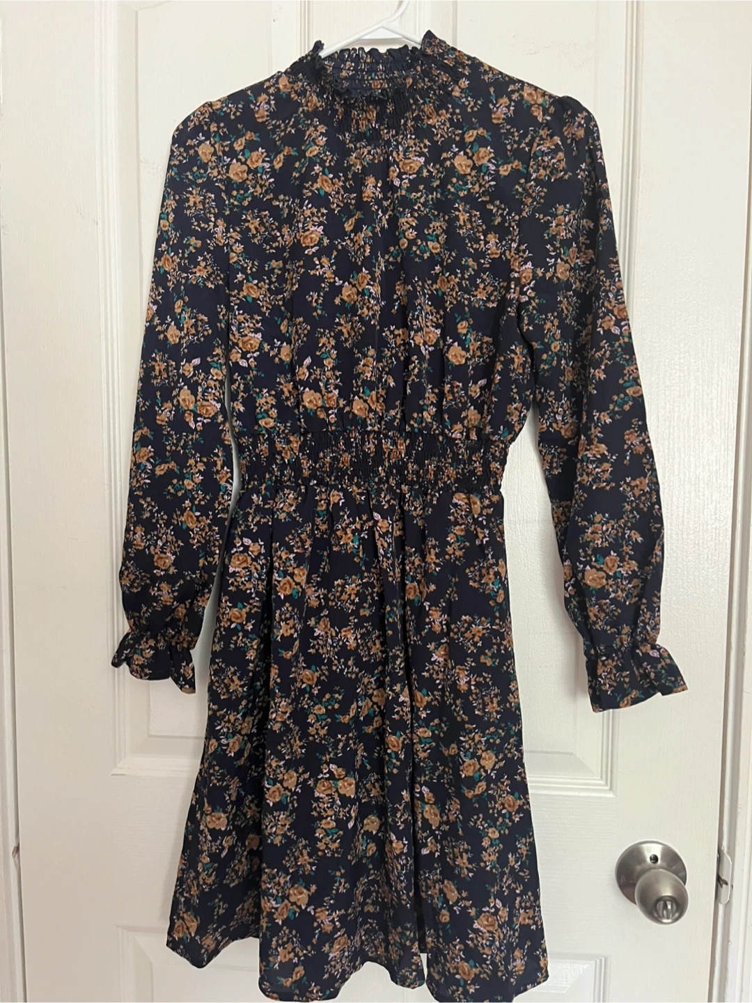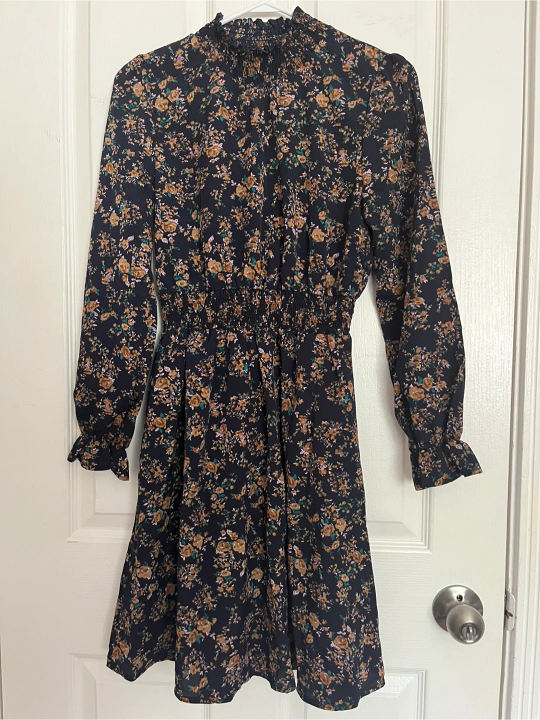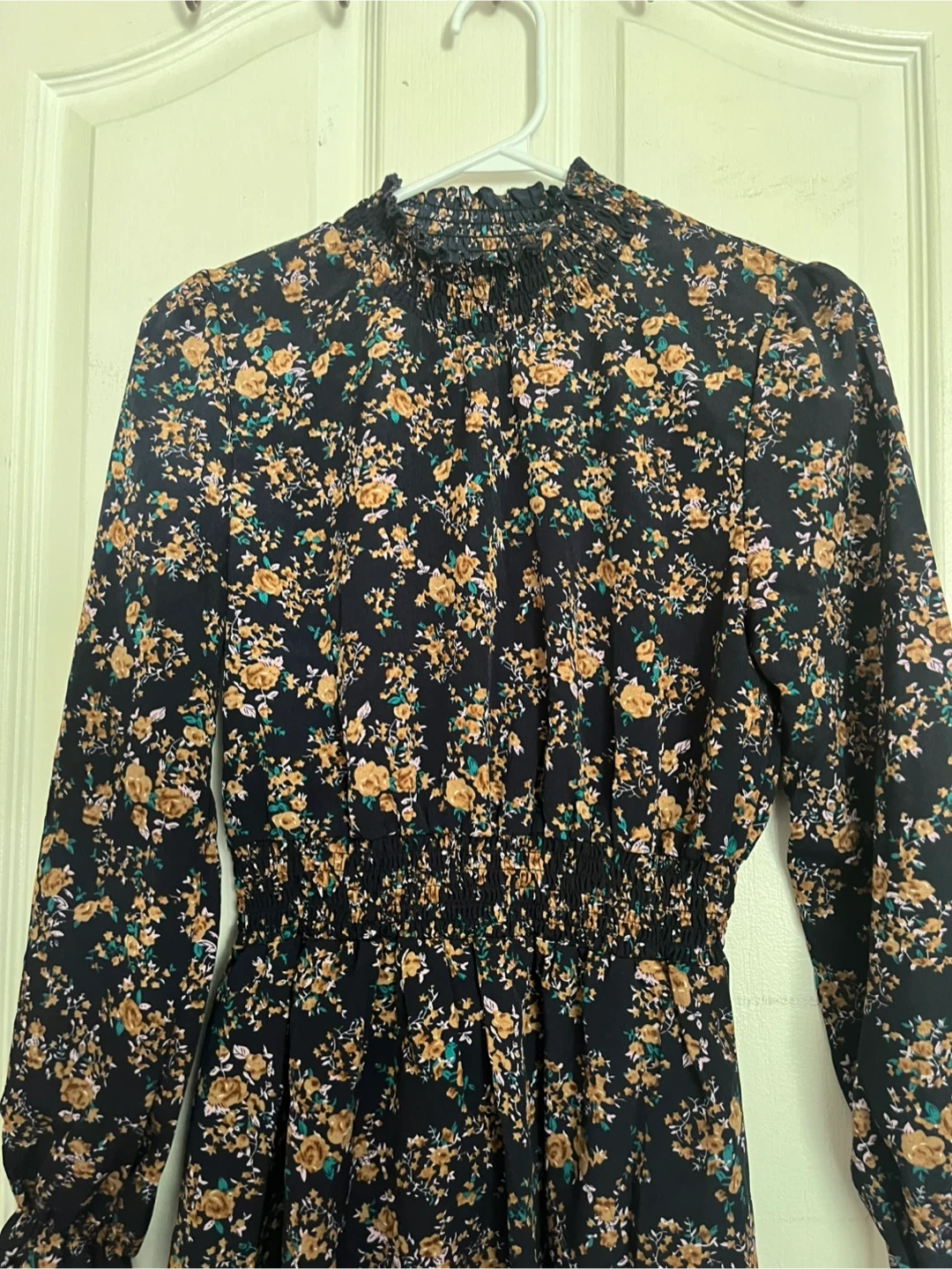 A lovely floral print dress in size small! The dress features a high neckline with ruffles and an elastic waist for a comfortable fit. The long sleeves have ruffled cuffs, adding a touch of elegance to the overall design. Perfect for any occasion!