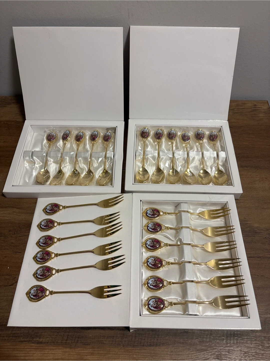 Selling a beautiful vintage set of gold-plated spoons and forks. They come brand new in their original boxes, nestled in satin lining. Perfect for adding a touch of elegance to your table or as a special gift! Just one spoon missing.๐ Two sets of 6 forks Each set for $25 Two set of 5 and 6 spoons Each sets for $25 You can make a fair deal for all