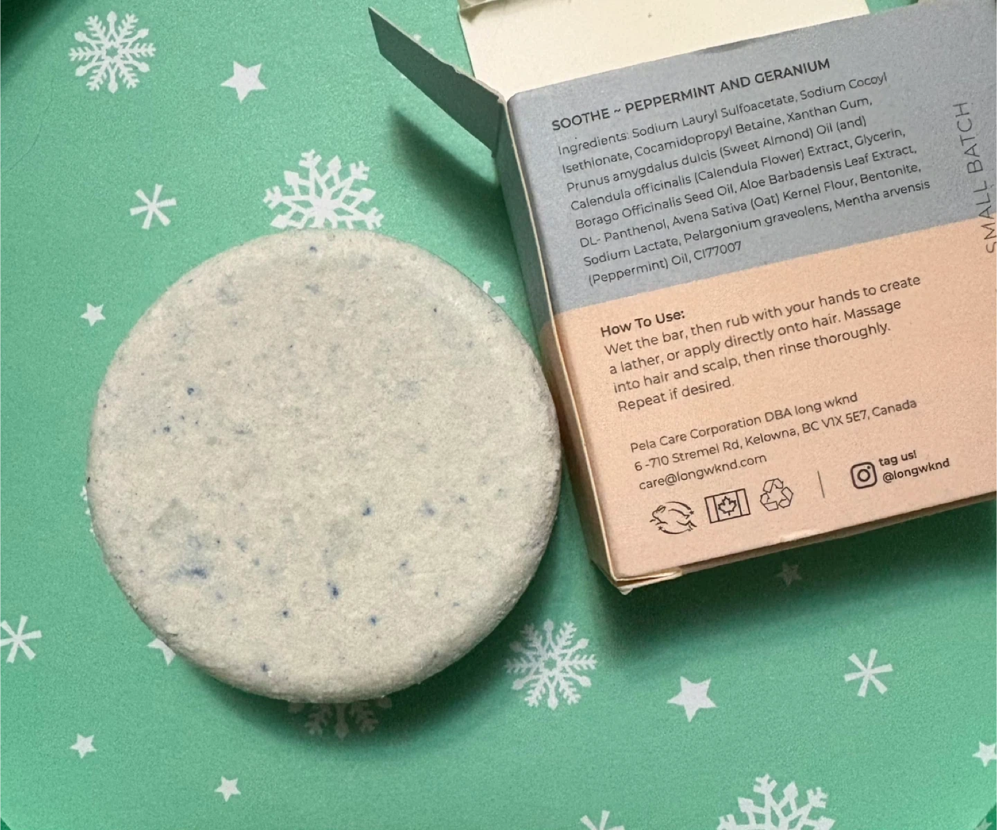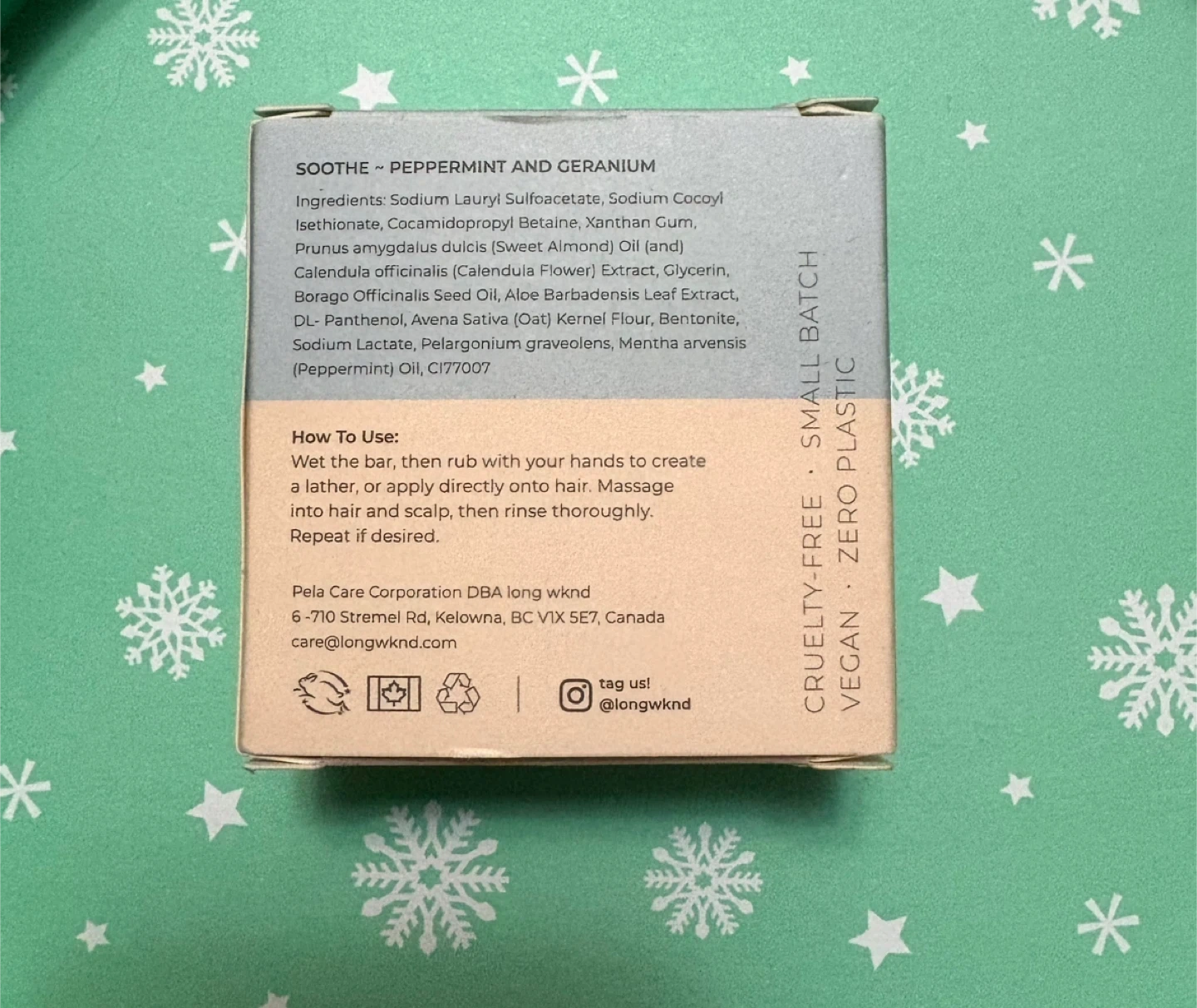 Long Wknd shampoo bar - Soothe For fine to oily hair Peppermint and Geranium Made in Canada Cash preferred or etransfer accepted from verified users Shipping options available Porch pick locations: Markham - Markham Rd & 16th Ave Oshawa - Wilson Rd & Adelaide Ave Pls feel free to ask me any questions