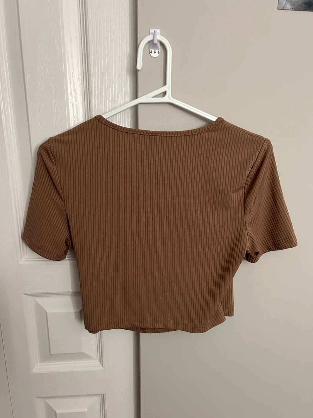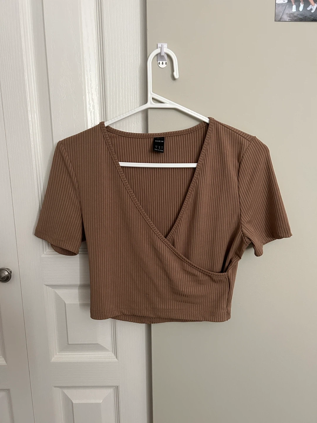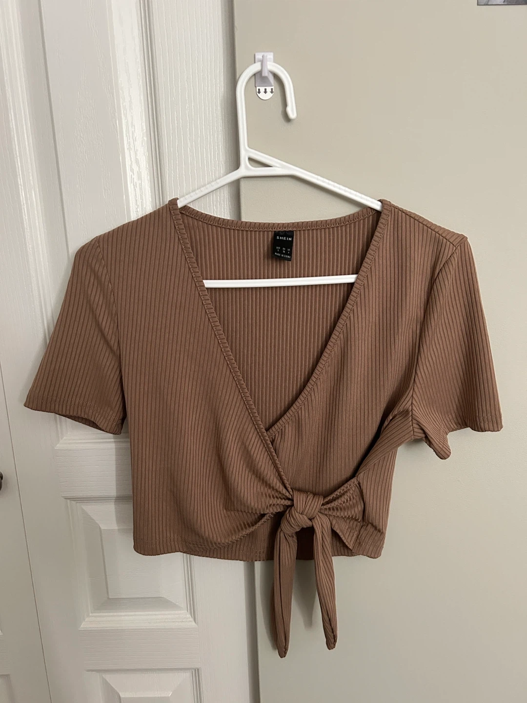 Cute brown ribbed crop top from Shein! It's a size small and in great condition. Perfect for layering or wearing on its own. It features a stylish wrap front with a tie detail. Meet in Burnaby