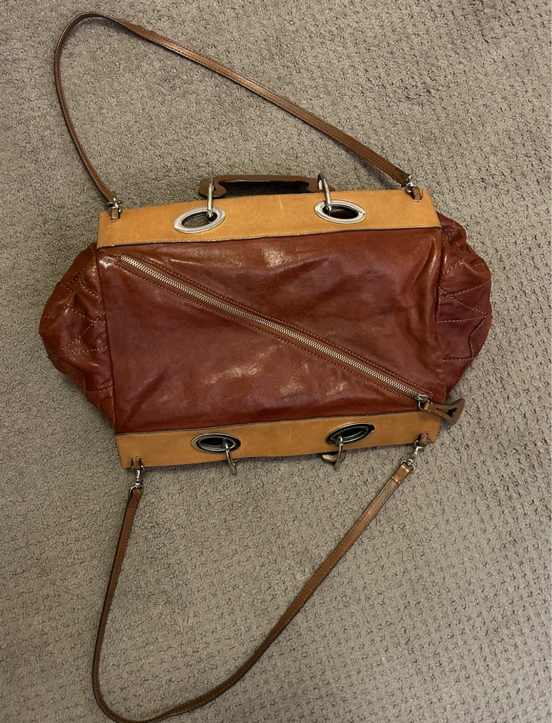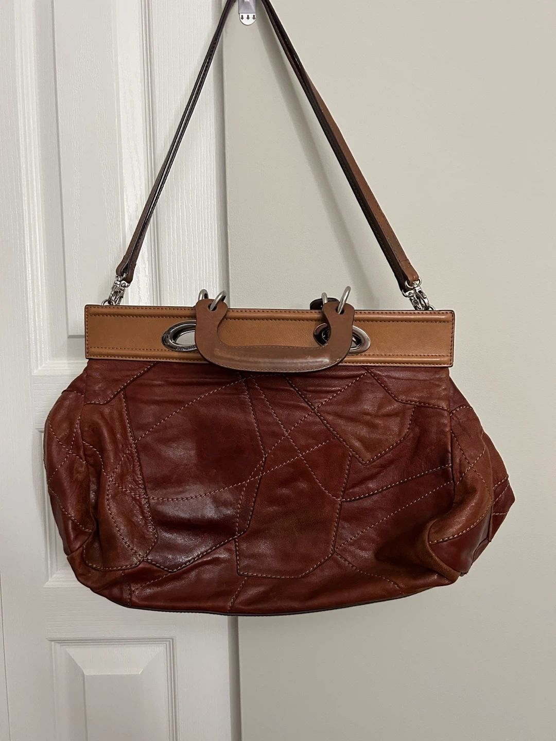 Selling a unique leather patchwork shoulder bag. It's in good condition and has a stylish, vintage look. Perfect for adding a touch of character to any outfit! Can wear multiple ways. Meet in Burnaby