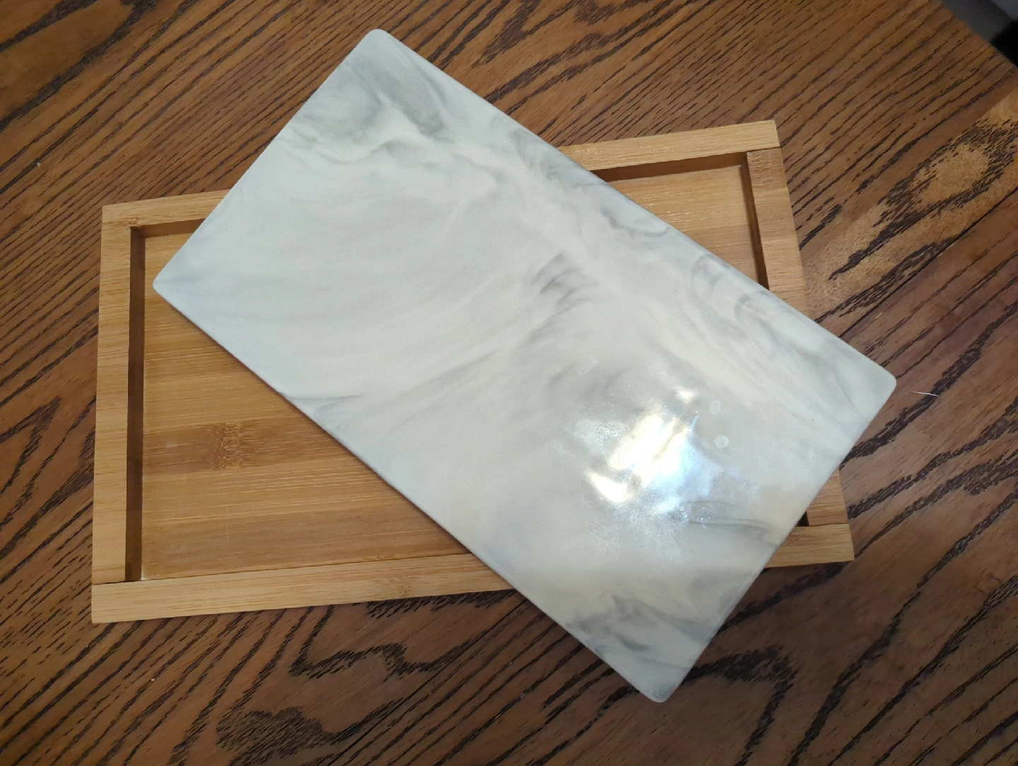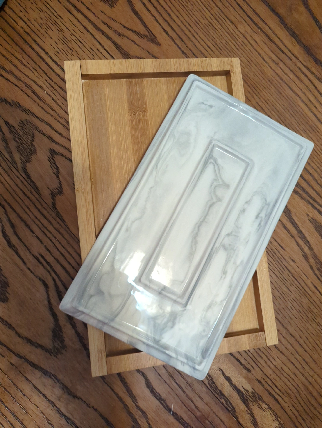 Here's a lovely tray with a marble pattern insert tray and a bamboo frame! It's in great shape and would be perfect for serving snacks or displaying items around the house