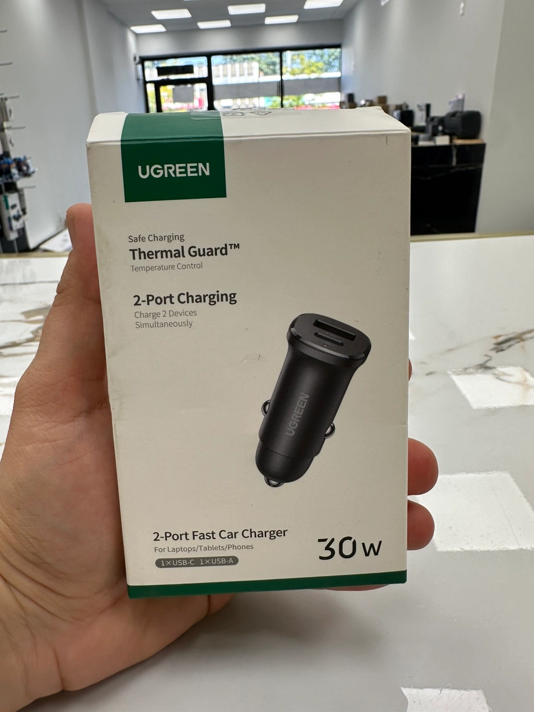 Selling a UGREEN 2-Port Fast Car Charger, 30W. It's designed for laptops, tablets, and phones, featuring both 1x USB-C and 1x USB-A ports. The charger includes Safe Charging with Thermal Guard™ for temperature control, allowing you to charge two devices simultaneously. Brand new in box!