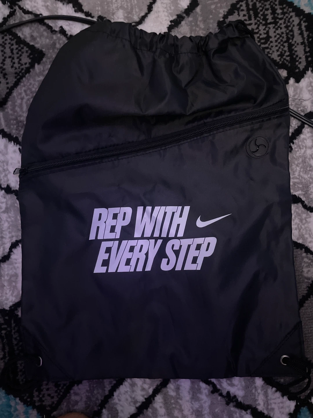 Selling a black Nike drawstring bag! It has a zipper pocket on the front and says "Rep With Every Step" in white lettering. It's in great condition and perfect for carrying your gym clothes or everyday essentials