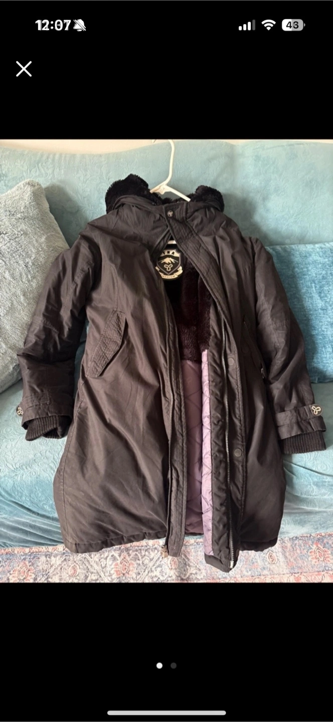 Selling a Tristan outerwear winter coat in black. It has a fur-lined hood and a purple lining. Perfect for the cold weather!