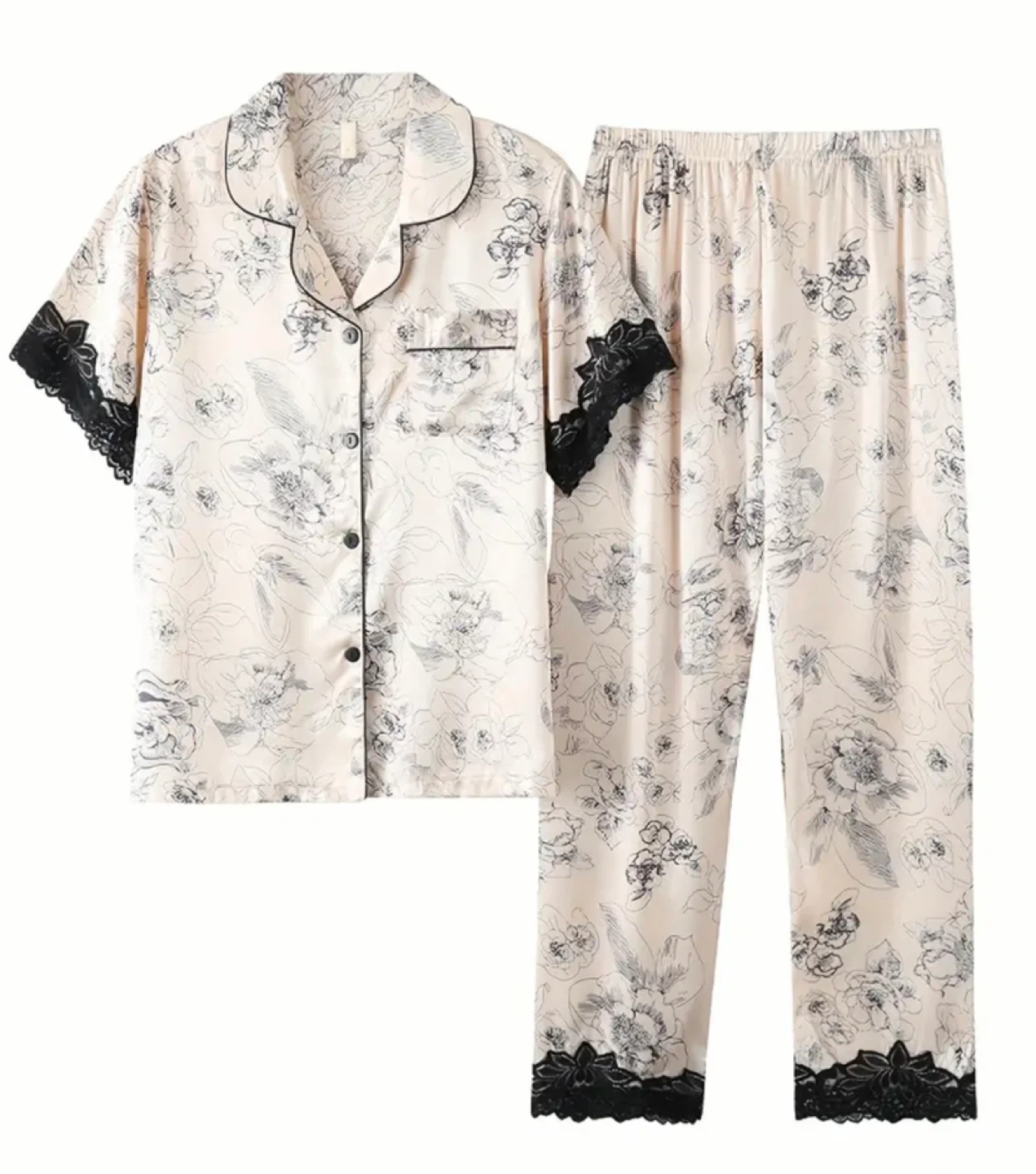 This is a cute pajama set featuring a floral pattern and delicate lace trim. It includes a short-sleeved button-down top and matching pants. Perfect for a comfortable and stylish night's sleep!