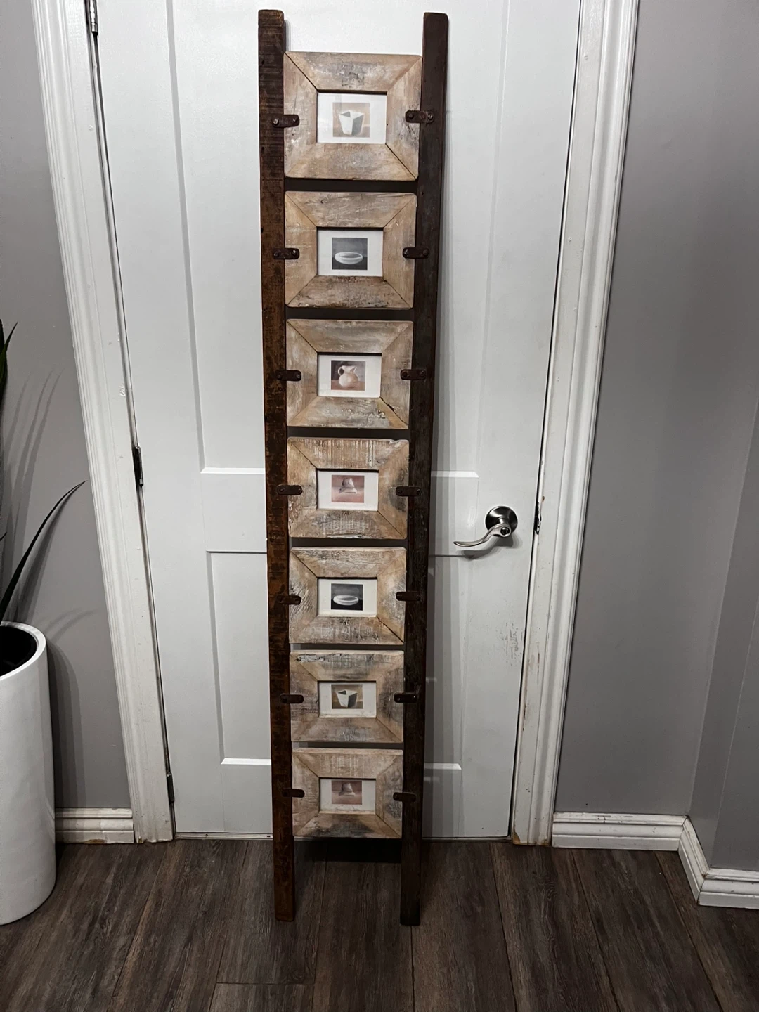 Selling a leaning rustic wooden ladder with attached picture frames. It's a unique piece that adds a touch of vintage charm to any room. Perfect for displaying your favourite photos or artwork! Measures at 68.5” H x 12.25” W. Displays 7 3.5” x 5” picture. Pick up only. Closest intersection is Jane st and Eglinton ave.