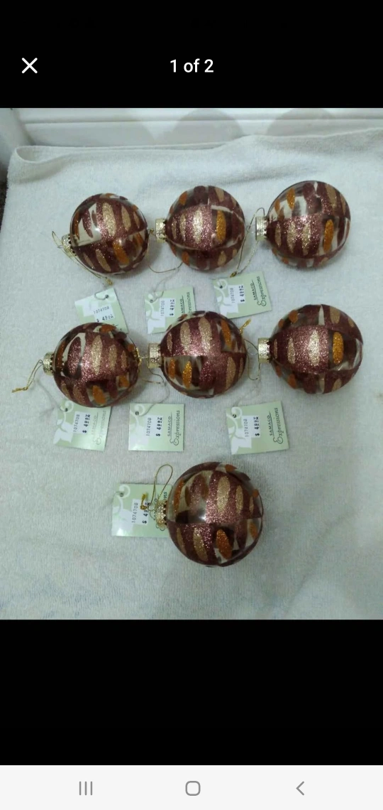 Selling a set of Samaco Expressions ornaments. They have a really nice design with brown and gold glitter accents. Each ornament still has its original tag attached, priced at $4.99.