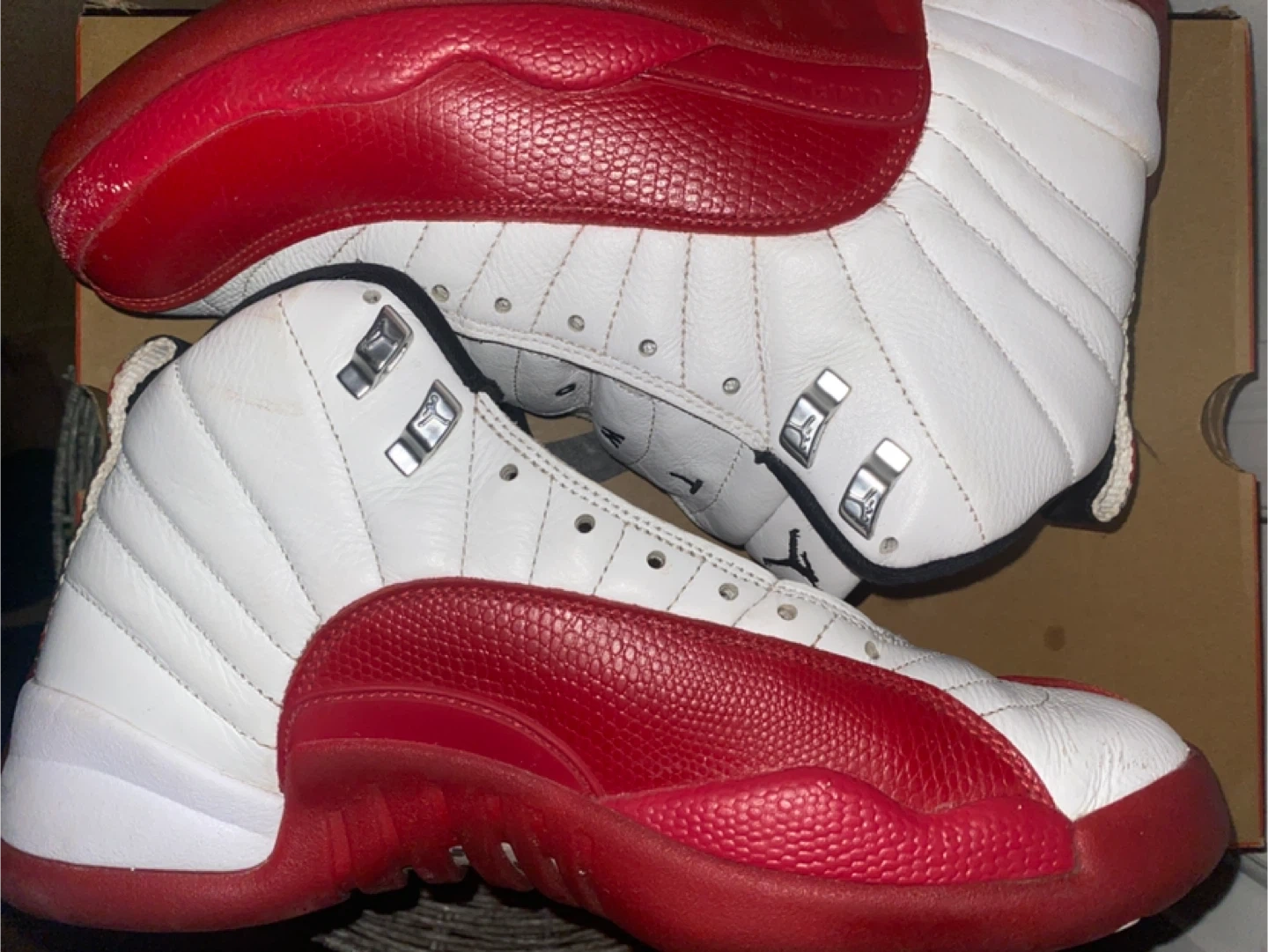 Selling a pair of Air Jordan 12 Retro sneakers in white and red. They are in good condition and come with the original box. The size is 9.5 US