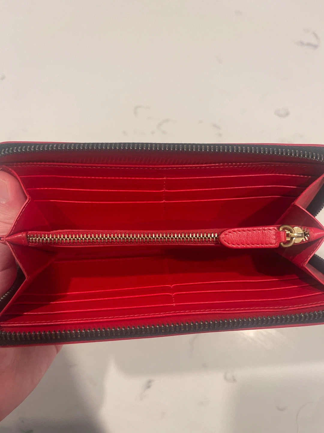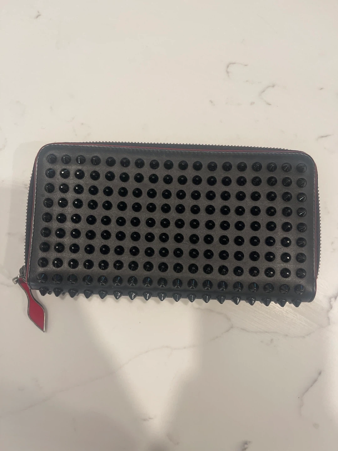 Selling a Christian Louboutin Panettone wallet! It's a stylish zip-around wallet with the brand's signature studded design. The interior is a vibrant red, adding a pop of colour! It's in great condition and ready for a new home