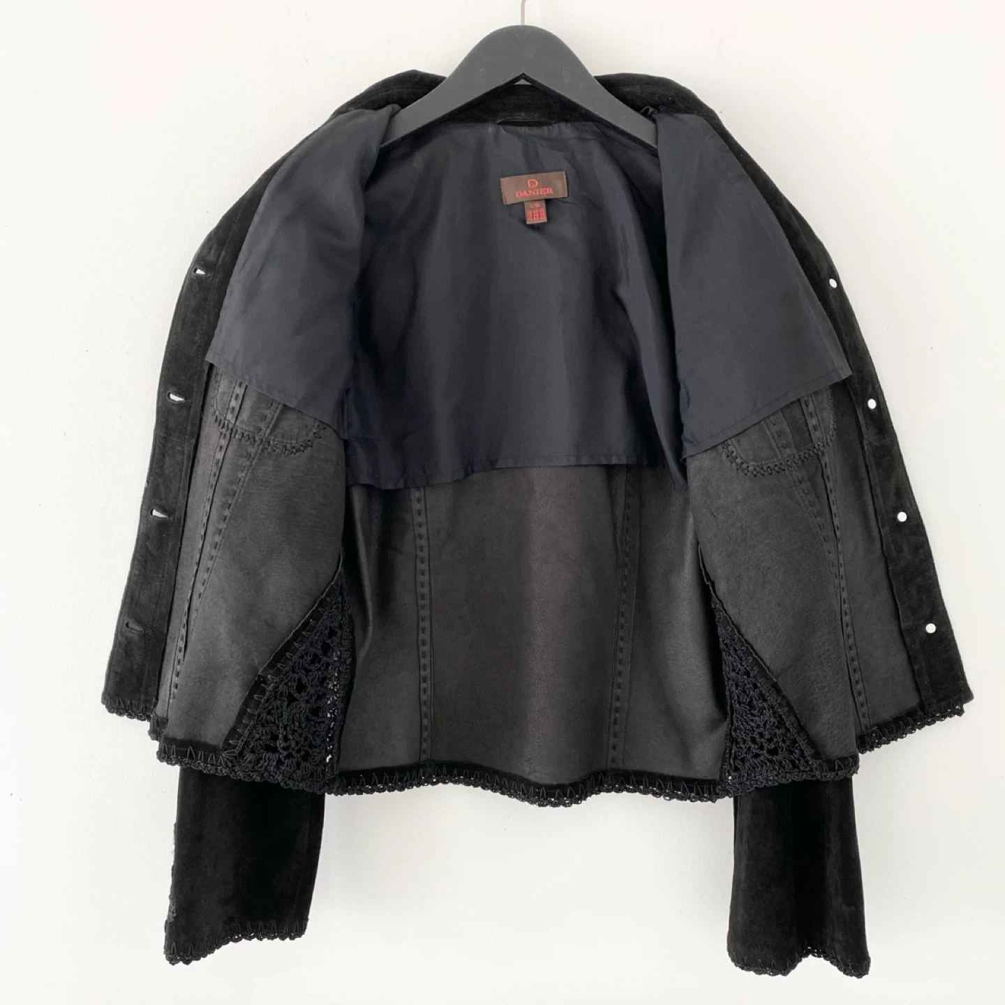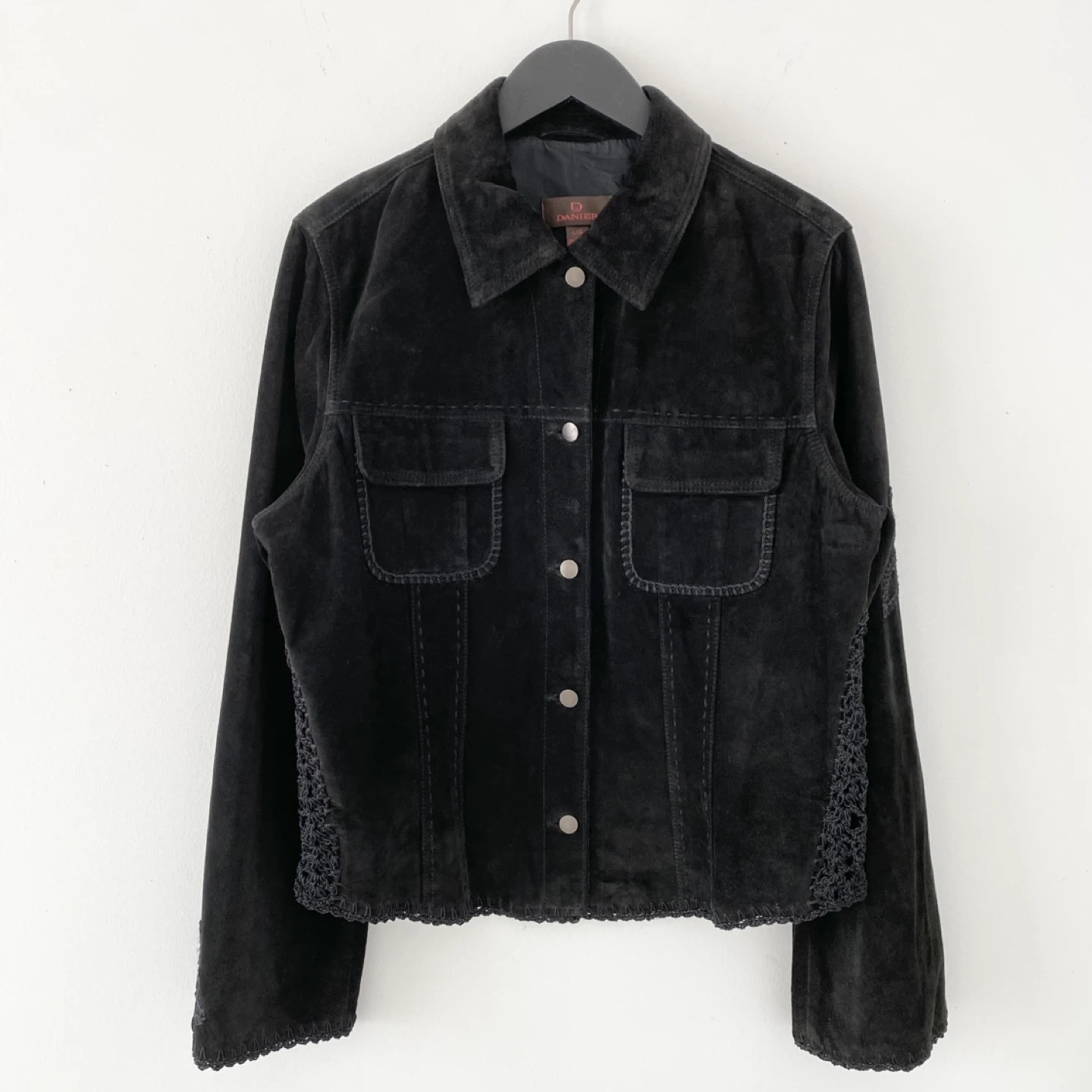 Pick up only in Leslieville (Queen and Pape) Check out other listings! Danier suede jacket. Feature slightly flared sleeves, saddle stitches and crochet details. Made of genuine leather (suede) in a rich black colour. Half lined. There's some general wear and some faint marks especially around the front button closure area - please see the pic carefully. Otherwise it's clean and in great condition. Size L Approximate measurements laid flat Shoulder 17” Pit to pit 20.5” Center back length 22” Shoulder to cuff 25”