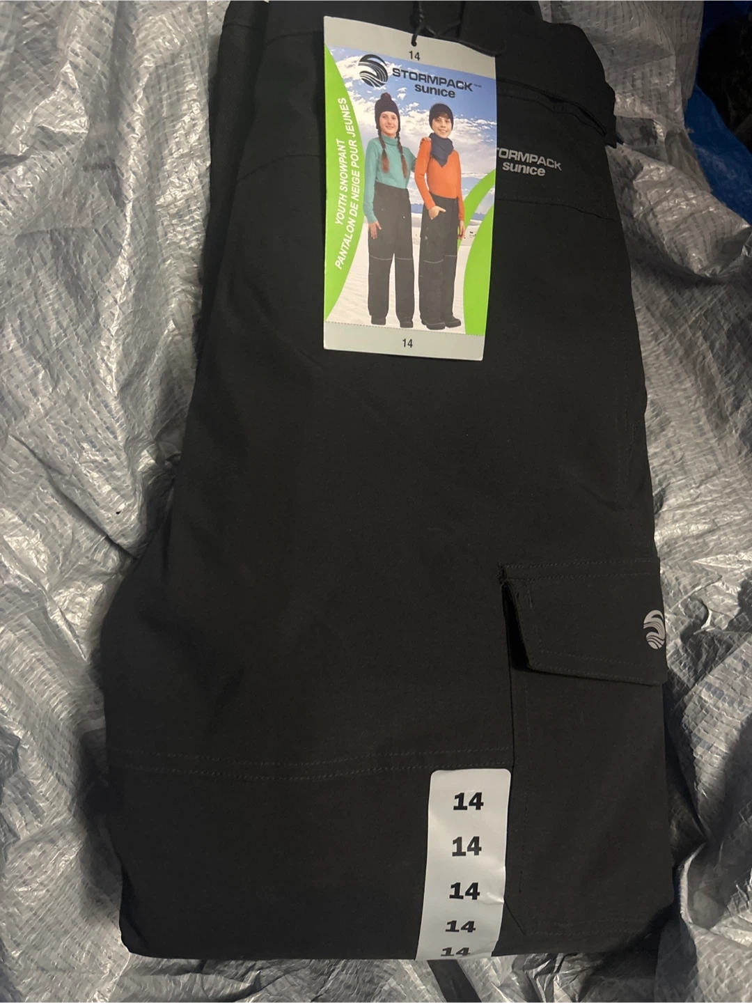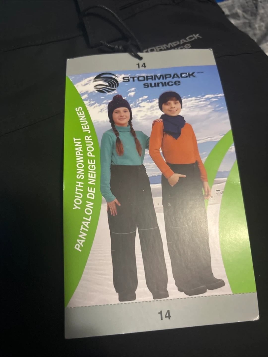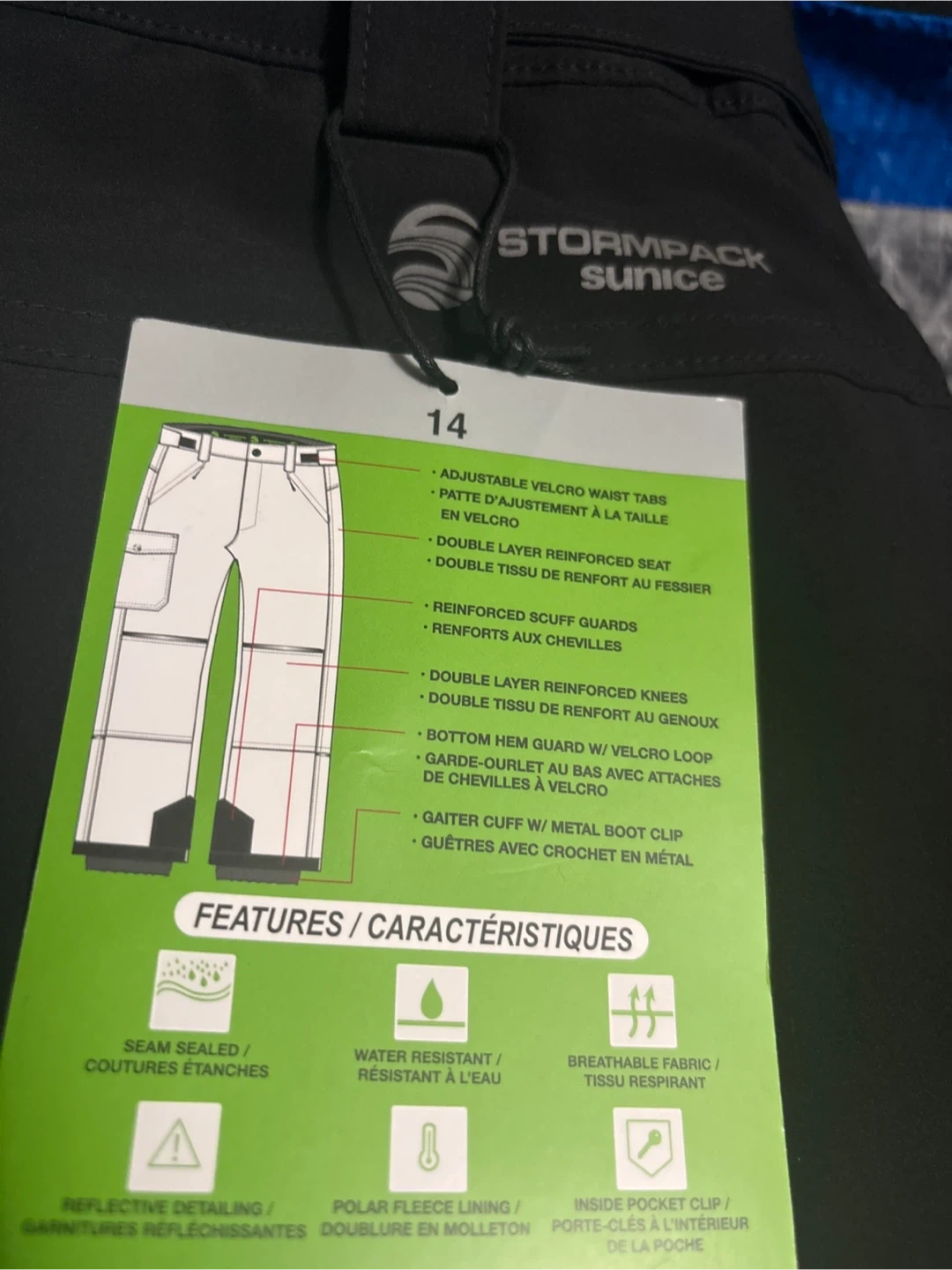 Youth snow pants from Stormpack Sunice, size 14! These pants have adjustable Velcro waist tabs, reinforced scuff guards, and double-layer reinforced knees. They also feature a bottom hem guard with a Velcro loop and a gaiter cuff with a metal boot clip. They are seam-sealed, water-resistant, and made with breathable fabric