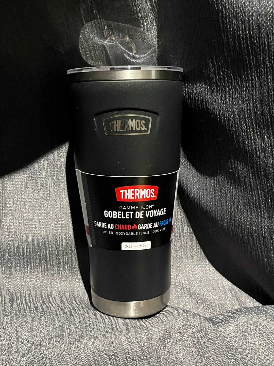I'm selling a Thermos Gamme Icon GoBelet de Voyage, with a capacity of 710ml. It's designed to keep your drinks hot or cold. Includes instructions