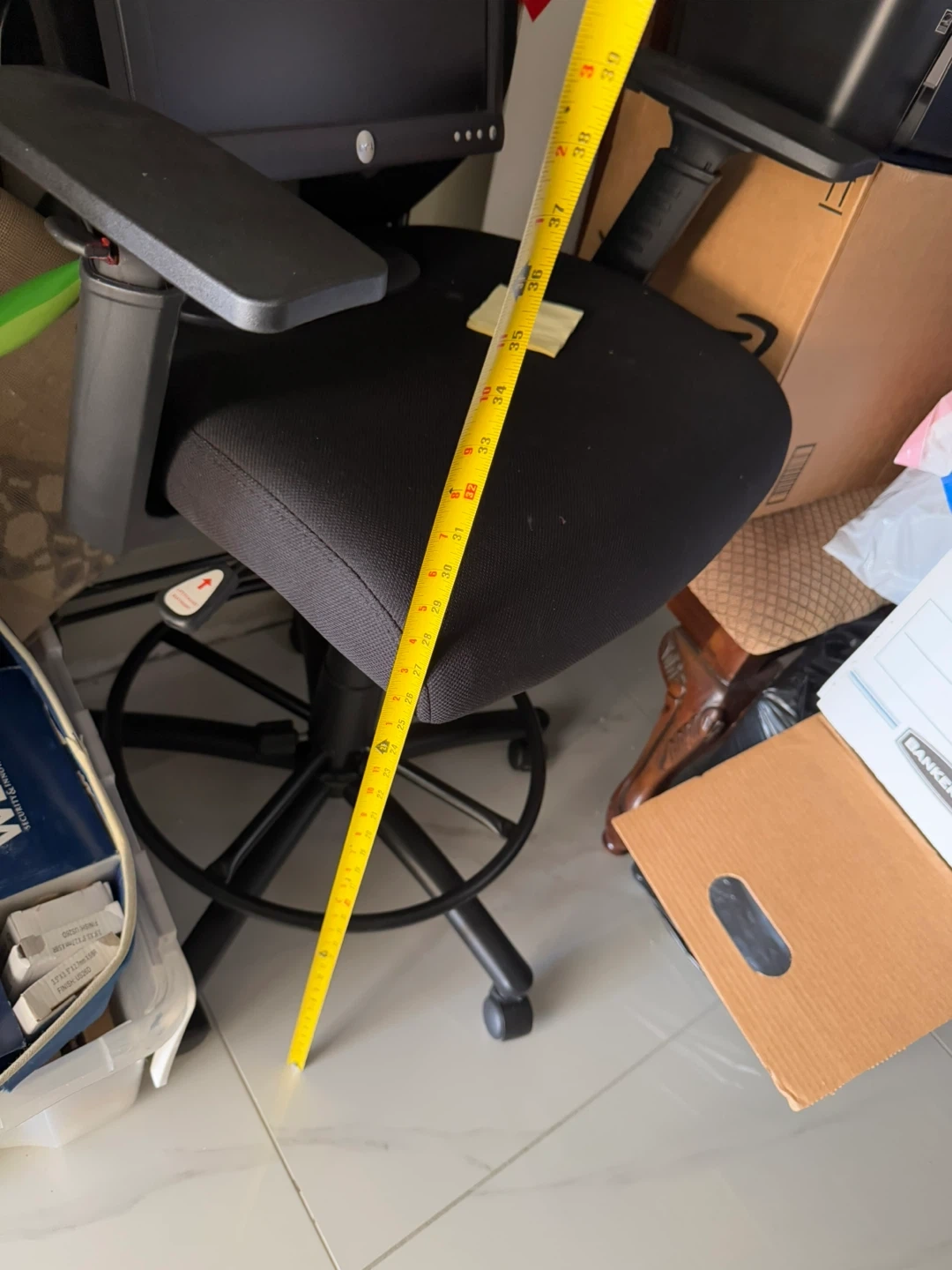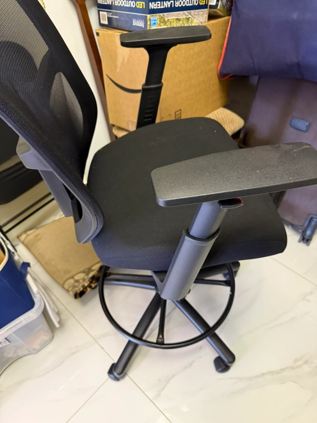 Selling a comfortable black office chair! It can go with high desk.It's in good condition and ready to use for your home office or workspace. The chair features a mesh back and adjustable armrests for added comfort