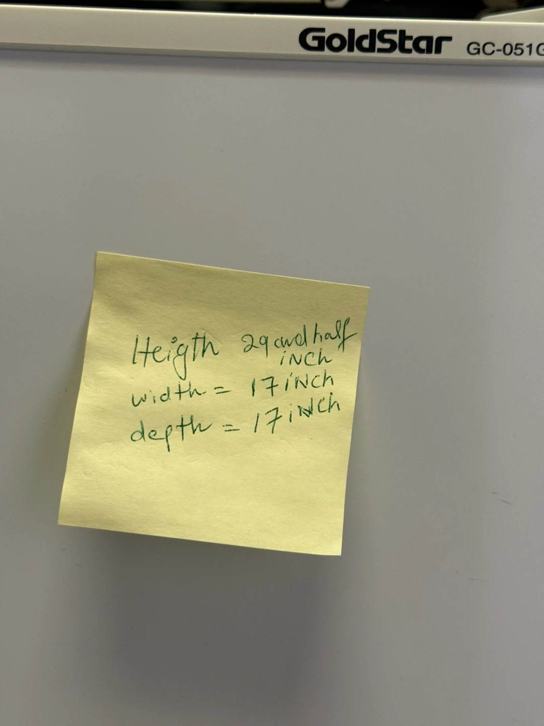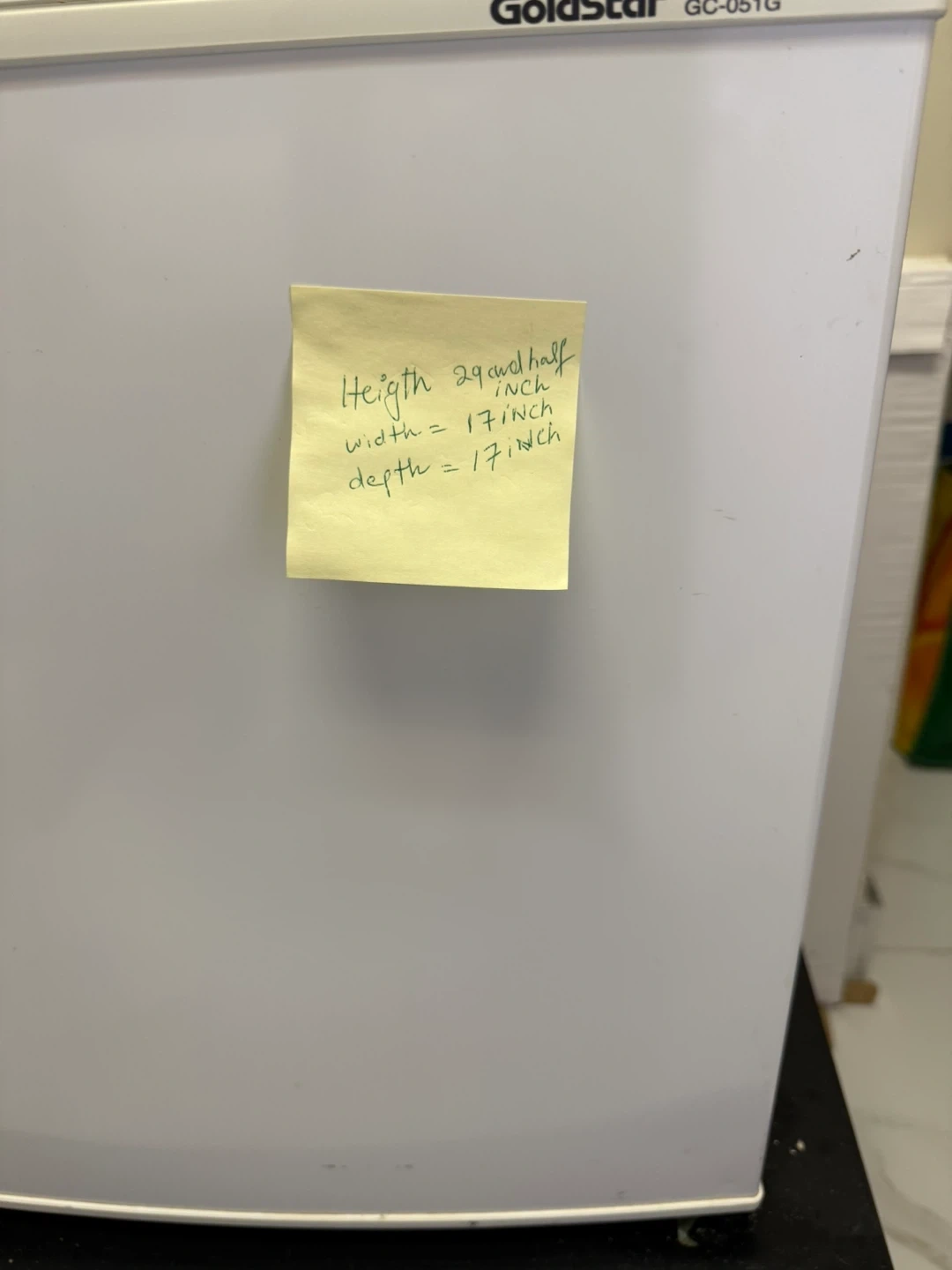 Selling a GoldStar mini fridge, model GC-051G. It's a compact fridge perfect for small spaces. The dimensions are approximately: - Height: 29.5 inches - Width: 17 inches - Depth: 17 inches