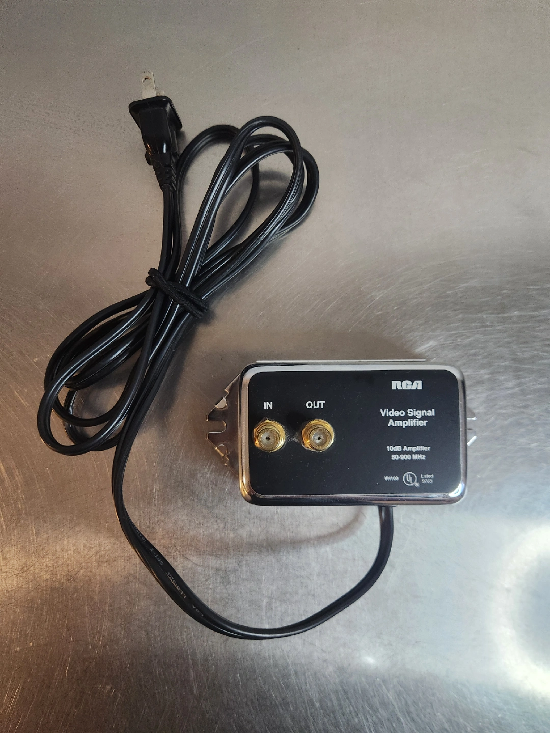 Selling an RCA Video Signal Amplifier, model VH100B. It is a 10dB amplifier for 50-900 MHz. The manufacturing date is 2015 June 30.