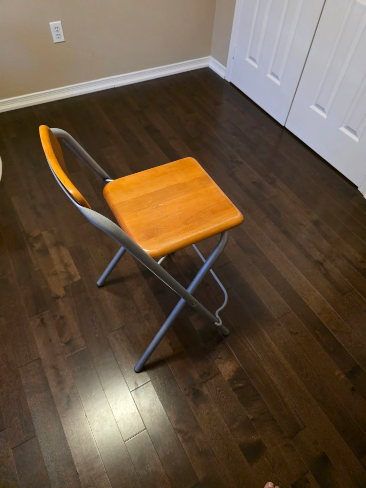 Selling a folding chair with a wooden seat. It's perfect for extra seating when you have guests over or for small spaces where you need a chair that can be easily stored away. The chair is in good condition and ready for a new home!