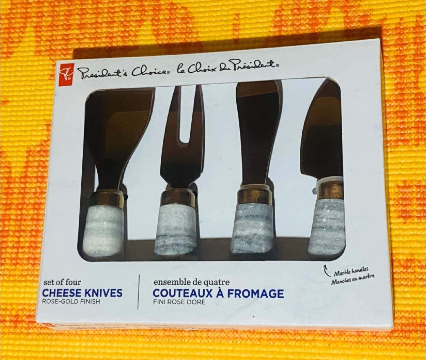 Selling a brand new set of four cheese knives from President's Choice! These knives have a rose-gold finish and marble handles. The set includes a variety of knives perfect for any cheese board