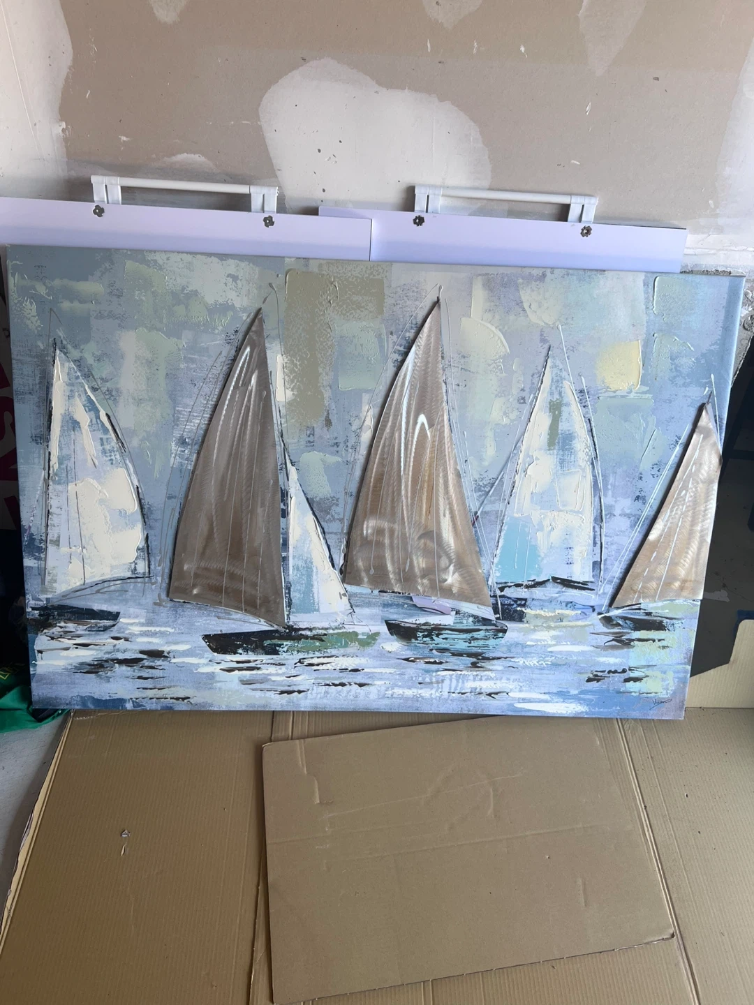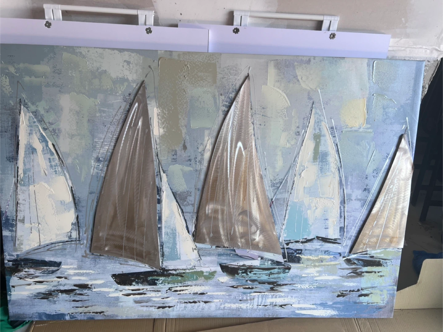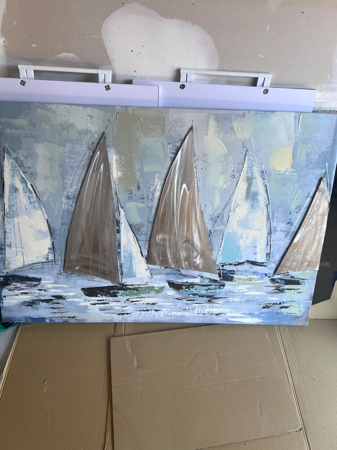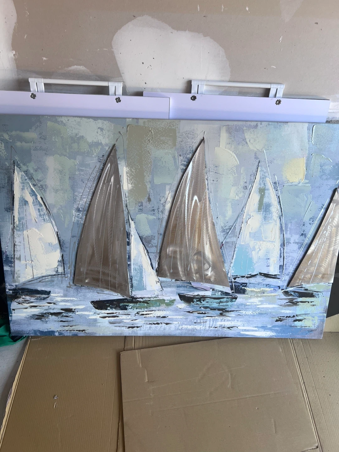A lovely painting of sailboats on a light blue sea. It's in great shape and would look wonderful in any room of the house