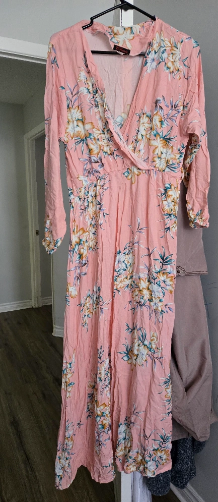 Selling a lovely Cassis maxi dress! It features a beautiful floral pattern on a soft pink background. The dress is a size medium and has a flattering wrap-style neckline. Perfect for summer days or evenings out